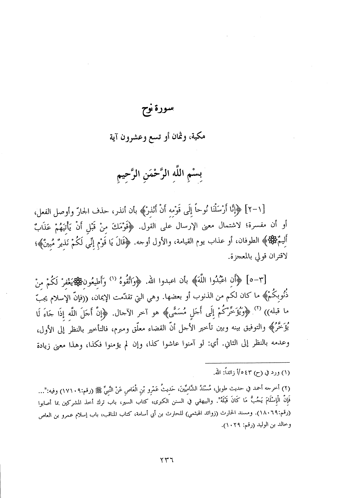 (إِنَّا أَرْسَلْنَا نُوحًا إِلَى قَوْمِهِ أَنْ أَنْذِرْ ... (1) بأن أنذر، حذف الجارّ وأوصل الفعل، أو أن مفسرة؛ لاشتمال معنى الإرسال على القول. (قَوْمَكَ مِنْ قَبْلِ أَنْ يَأْتِيَهُمْ عَذَابٌ أَلِيمٌ) الطوفان، أو عذاب يوم القيامة، والأول أوجه. (قَالَ يَا قَوْمِ إِنِّي لَكُمْ نَذِيرٌ مُبِينٌ (2) لاقتران قولي بالمعجزة.