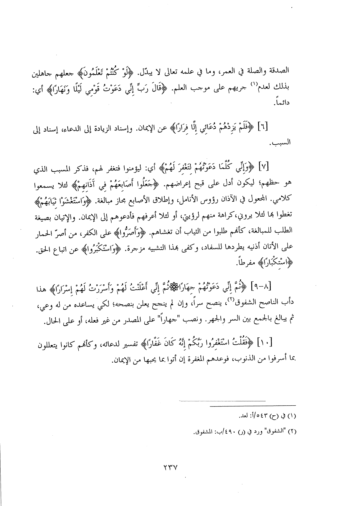 الصدقة والصلة في العمر، وما في علمه تعالى لا يبدّل. (لَوْ كُنْتُمْ تَعْلَمُونَ) جعلهم جاهلين بذلك لعدم جريهم على موجب العلم. (قَالَ رَبِّ إِنِّي دَعَوْتُ قَوْمِي لَيْلًا وَنَهَارًا (5) أي: دائماً.