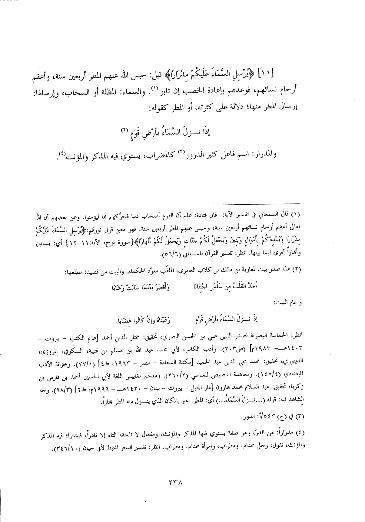 (يُرْسِلِ السَّمَاءَ عَلَيْكُمْ مِدْرَارًا (11) قيل: حبس اللَّه عنهم المطر أربعين ستة، وأعقم أرحام نسائهم، فوعدهم بإعادة الخصب إن تابوا. والسماء: المظلة أو السحاب، وإرسالها: إرسال المطر منها؛ دلالة على كثرته، أو المطر كقوله: