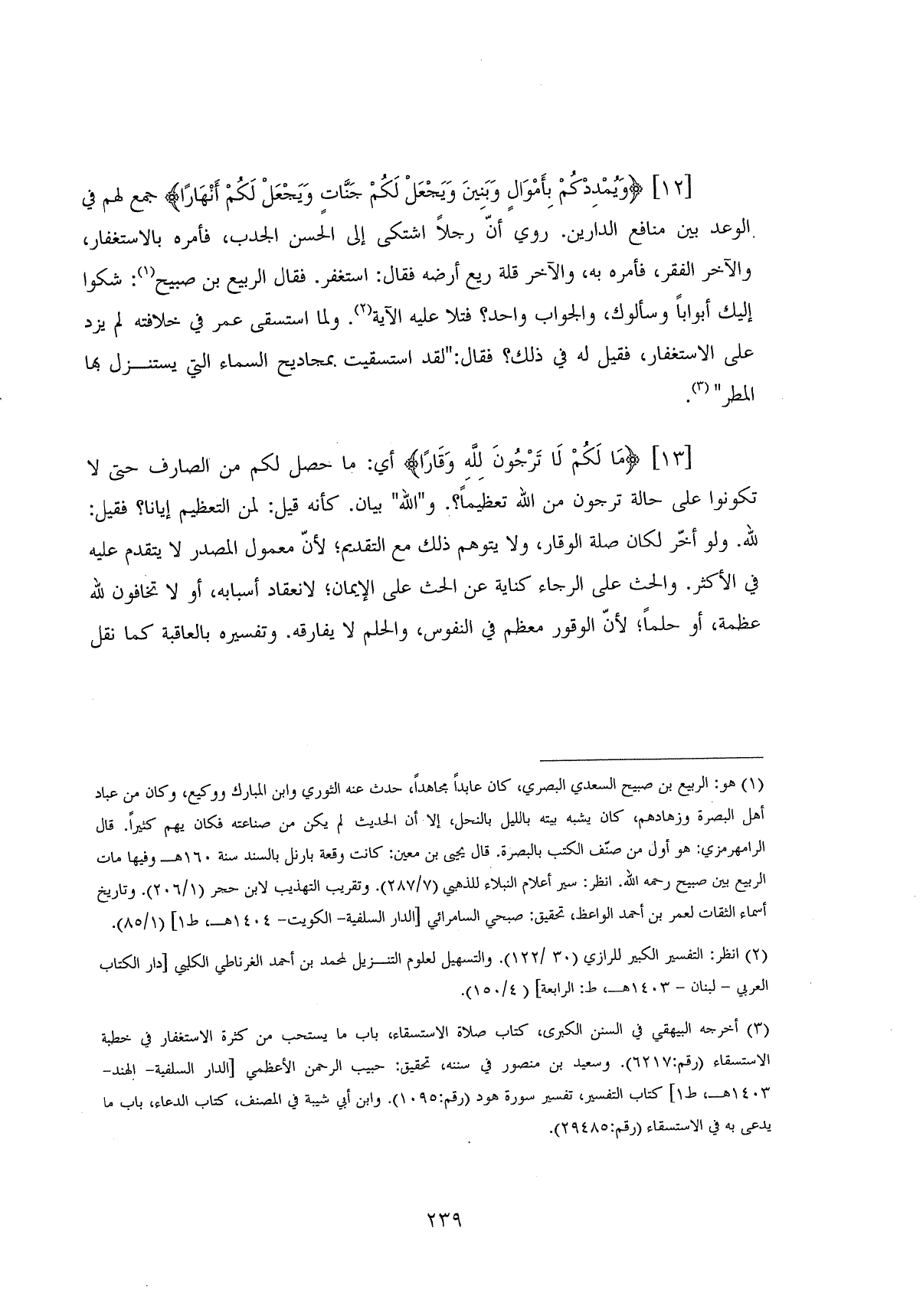 (وَيُمْدِدْكُمْ بِأَمْوَالٍ وَبَنِينَ وَيَجْعَلْ لَكُمْ جَنَّاتٍ وَيَجْعَلْ لَكُمْ أَنْهَارًا (12) جمع لهم في الوعد بين منافع الدارين. روي أنَّ رجلاً اشتكى إلى الحسن الجدب، فأمره بالاستغفار، والآخر الفقر، فأمره به، والآخر قلة ريع أرضه فقال: استغفر. فقال الربيع بن صبيح: شكوا إليك أبواباً وسألوك، والجواب واحد؟ فتلا عليه الآية. ولما استسقى عمر في خلافته لم يزد على الاستغفار بها فقيل له في ذلك؟ فقال: " لقد استسقيت بمجاديح السماء التي يستنزل بها المطر.
