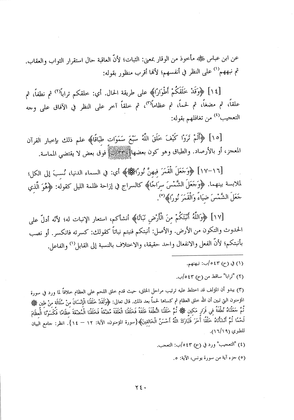 (وَقَدْ خَلَقَكُمْ أَطْوَارًا (14) على طريقة الحال. أي: خلقكم تراباً ثم نطفاً، ثم علقاً، ثم مضغاً، ثم لحماً، ثم عظاماً، ثم خلقاً آخر على النظر في الآفاق على وجه التعجيب من تغافلهم بقوله: