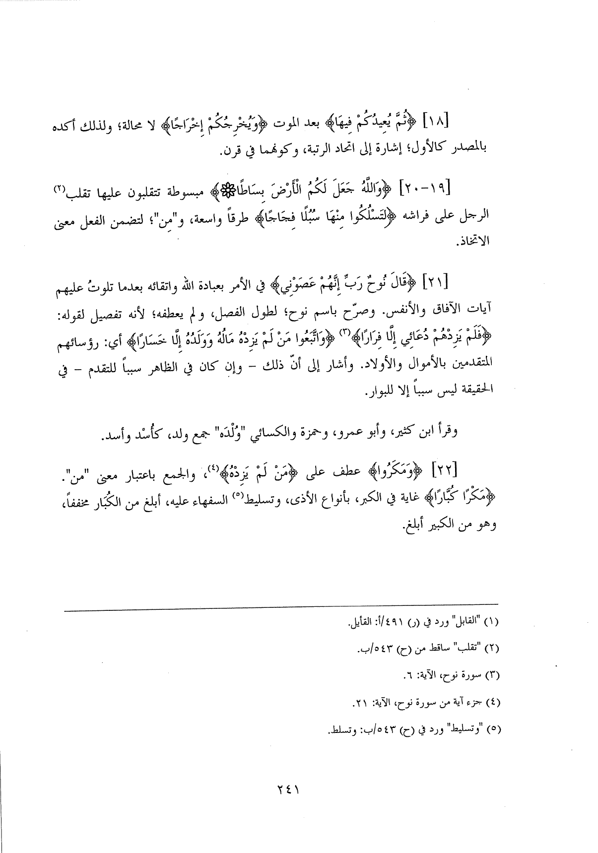 (قَالَ نُوحٌ رَبِّ إِنَّهُمْ عَصَوْنِي ... (21) في الأمر بعبادة اللَّه واتقائه بعدما تلوتُ عليهم آيات الآفاق والأنفس. وصرّح باسم نوح؛ لطول الفصل، ولم يعطفه؛ لأنه تفصيل لقوله: (فَلَمْ يَزِدْهُمْ دُعَائِي إِلَّا فِرَارًا) (وَاتَّبَعُوا مَنْ لَمْ يَزِدْهُ مَالُهُ وَوَلَدُهُ إِلَّا خَسَارًا) أي: رؤسائهم المتقدمين بالأموال والأولاد. وأشار إلى أنَّ ذلك -وإن كان في الظاهر سبباً للتقدم- في الحقيقة ليس سبباً إلا للبوار.