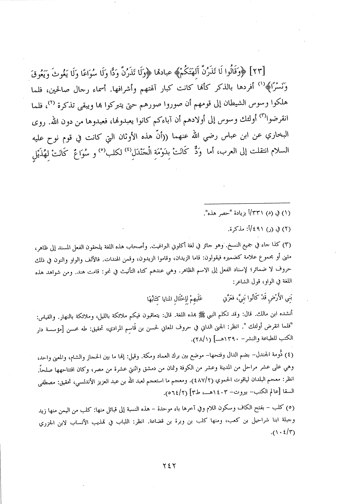 (وَقَالُوا لَا تَذَرُنَّ آلِهَتَكُمْ ... (23) عبادتها (وَلَا تَذَرُنَّ وَدًّا وَلَا سُوَاعًا وَلَا يَغُوثَ وَيَعُوقَ وَنَسْرًا) أفردها بالذكر كأنها كانت كبار آلهتهم وأشرافها. أسماء رجال صالحين، فلما هلكوا وسوس الشيطان إلى قومهم أن صوروا صورهم حتى يتبركوا بها ويبقى تذكرة، فلما انقرضوا أولئك وسوس إلى أولادهم أن آباءكم كانوا يعبدونها، فعبدوها من دون اللَّه. روى البخاري عن ابن عباس رضي اللَّه عنهما " أنَّ هذه الأوثان التي كانت في قوم نوح عليه السلام انتقلت إلى العرب، أما وَدٌّ كَانَتْ بِدومَةِ الْجَنْدَلِ لكلب وسُوَاعٌ كَانت لِهُذَيْلٍ