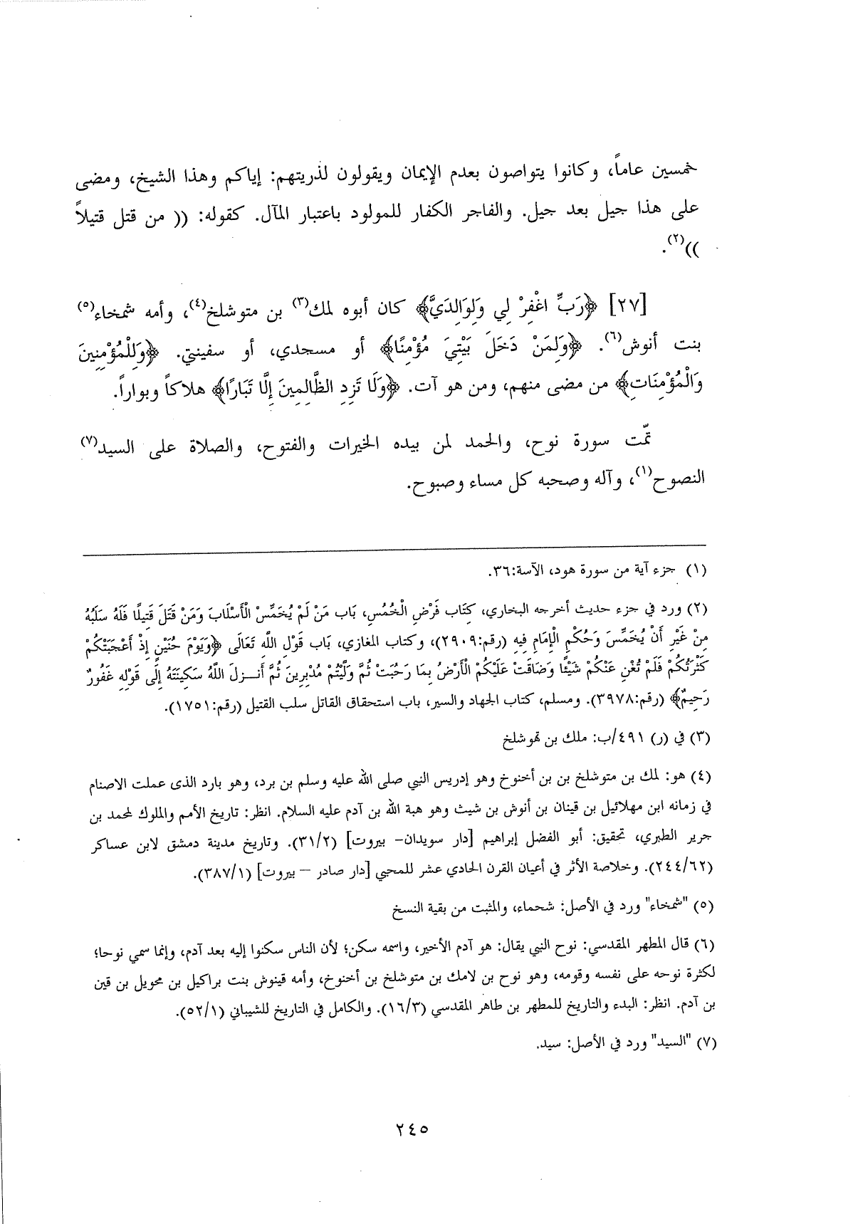 (رَبِّ اغْفِرْ لِي وَلِوَالِدَيَّ ... (28) كان أبوه لمك بن متوشلخ، وأمه شمخاء بنت أنوش. (وَلِمَنْ دَخَلَ بَيْتِيَ مُؤْمِنًا) أو مسجدي، أو سفينتي. (وَلِلْمُؤْمِنِينَ وَالْمُؤْمِنَاتِ) من مضى منهم، ومن هو آتٍ، (وَلَا تَزِدِ الظَّالِمِينَ إِلَّا تَبَارًا) هلاكاً وبواراً.