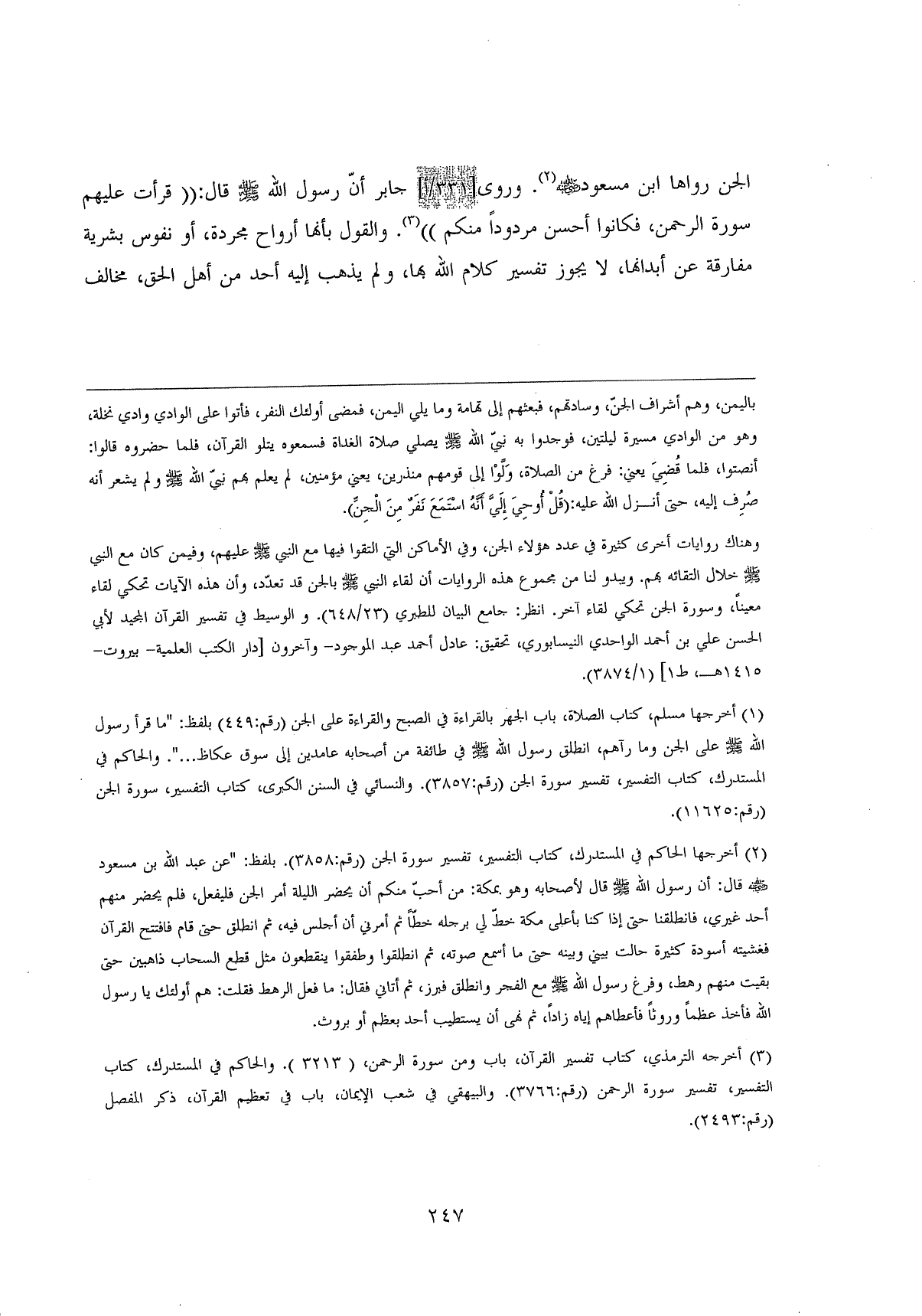 الجن رواها ابن مسعود - رضي الله عنه -. وروى جابر أن رسول الله - صلى الله عليه وسلم - قال " قرأت سورة الرحمن، فكانوا أحسن مردوداً منكم " والقول بأنها أرواح مجردة، أو نفوس بشرية مفارقة عن أبدانها، لا يجوز تفسير كلام اللَّه بها، ولم يذهب إليه أحد من أهل الحق، مخالف