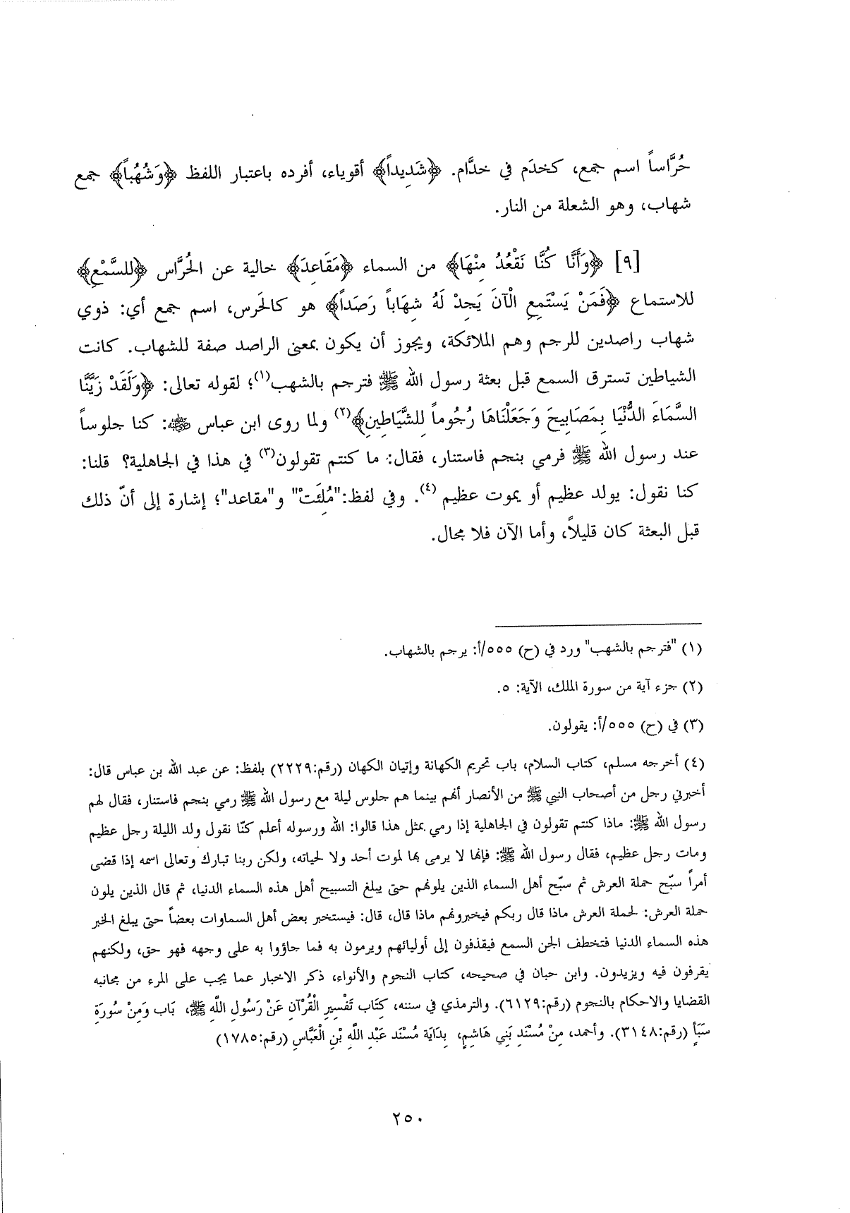 (وَأَنَّا كُنَّا نَقْعُدُ مِنْهَا ... (9) من السماء (مَقَاعِدَ) خالية عن الحرَّاس (لِلسَّمْعِ) للاستماع (فَمَنْ يَسْتَمِعِ الْآنَ يَجِدْ لَهُ شِهَابًا رَصَدًا) هو كالحَرس، اسم جمع أي: ذوي شهاب راصدين للرجم وهم الملائكة، ويجوز أن يكون بمعنى الراصد صفة للشهاب. كانت الشياطين تسترق السمع قبل بعثة رسول اللَّه - صلى الله عليه وسلم - فترجم بالشهب؛ لقوله تعالى: (وَلَقَدْ زَيَّنَّا السَّمَاءَ الدُّنْيَا بِمَصَابِيحَ وَجَعَلْنَاهَا رُجُومًا لِلشَيَاطِينِ) ولما روى ابن عباس - رضي الله عنهما -: كنا جلوساً عند رسول اللَّه - صلى الله عليه وسلم - فرمي بنجم فاستنار، فقال: ما كنتم تقولون في هذا في الجاهلية؟ قلنا: كنا نقول: يولد عظيم أو يموت عظيم. وفي لفظ: " مُلِئَتْ " و " مقاعد "؛ إشارة إلى أنَّ ذلك قبل البعثة كان قليلاً، وأما الآن فلا مجال.