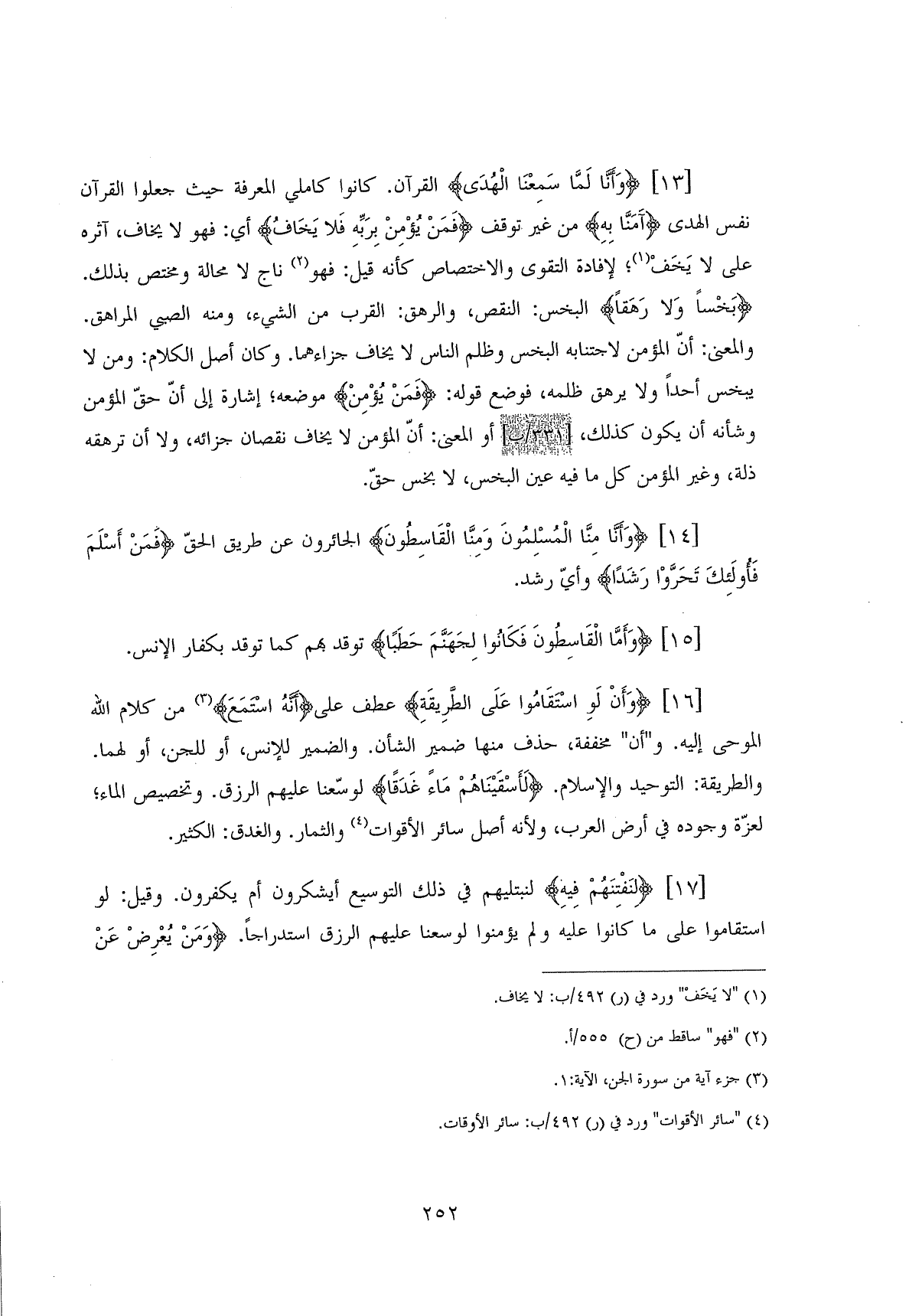 (بَخْسًا وَلَا رَهَقًا) البخس: النقص، والرهق: القرب من الشيء، ومنه الصبي المراهق. والمعنى: أنَّ المؤمن لاجتنابة البخس وظلم الناس لا يخاف جزاءهما. وكان أصل الكلام: ومن لا يبخس أحداً ولا يرهق ظلمه، فوضع قوله: (فَمَن يُؤْمِنْ) موضعه، إشارة إلى أنَّ حقّ المؤمن وشأنه أن يكون كذلك، أو المعنى: أن المومن لا يخاف نقصان جزائه، ولا أن ترهقه ذلة، وغير المؤمن كل ما فيه عين البخس، لا بخس حقّ.
