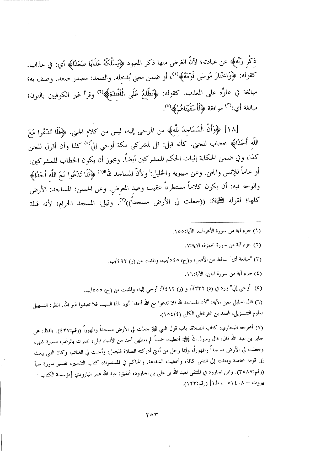 (وَأَنَّ الْمَسَاجِدَ لِلَّهِ ... (18) من الموحى إليه، ليس من كلام الجني. (فَلَا تَدْعُوا مَعَ اللَّهِ أَحَدًا) خطاب للجني. كأنه قيل: قل لمشركي مكة أوحي إليَّ كذا وأن أقول للجن كذا، وفي ضمن الحكاية إثبات الحكم للمشركين أيضاً. ويجوز أن يكون الخطاب للمشركين، أو عاماً للإنس والجن. وعن سيبويه والخليل: " ولأنَّ المساجد للَّه " (فَلَا تَدْعُوا مَعَ اللَّهِ أَحَدًا) والوجه فيه: أن يكون كلاماً مستطرداً عقيب وعيدِ المعرِضِ. وعن الحسن: المساجد: الأرض كلها؛ لقوله - صلى الله عليه وسلم -: " جعلت لي الأرض مسجداً ". وقيل: المسجد الحرام، لأنه قبلة