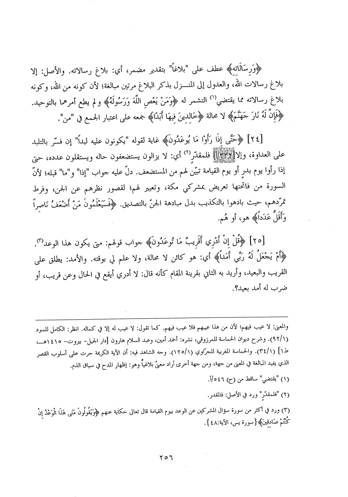 (حَتَّى إِذَا رَأَوْا مَا يُوعَدُونَ ... (24) غاية لقوله " يكونون عليه لبداً " إن فسّر بالتلبد على العداوة، وإلا فلمقدّرٍ أي: لا يزالون يستضعفون حاله ويستقلون عدده، حتى إذا رأوا يوم بدرٍ أو يوم القيامة تبيّن لهم من المستضعف. دلّ عليه جواب " إذا " و " ما " قبله؛ لأنَّ السورة من فاتحتها تعريف بمشركي مكة، وتعيير لهم؛ لقصور نظرهم عن الجن، وفرط تمرّدهم، حيث بادهوا بالتكذيب بدل مبادهة الجنَّ بالتصديق. (فَسَيَعْلَمُونَ مَنْ أَضْعَفُ نَاصِرًا وَأَقَلُّ عَدَدًا) هو، أو هُم.
