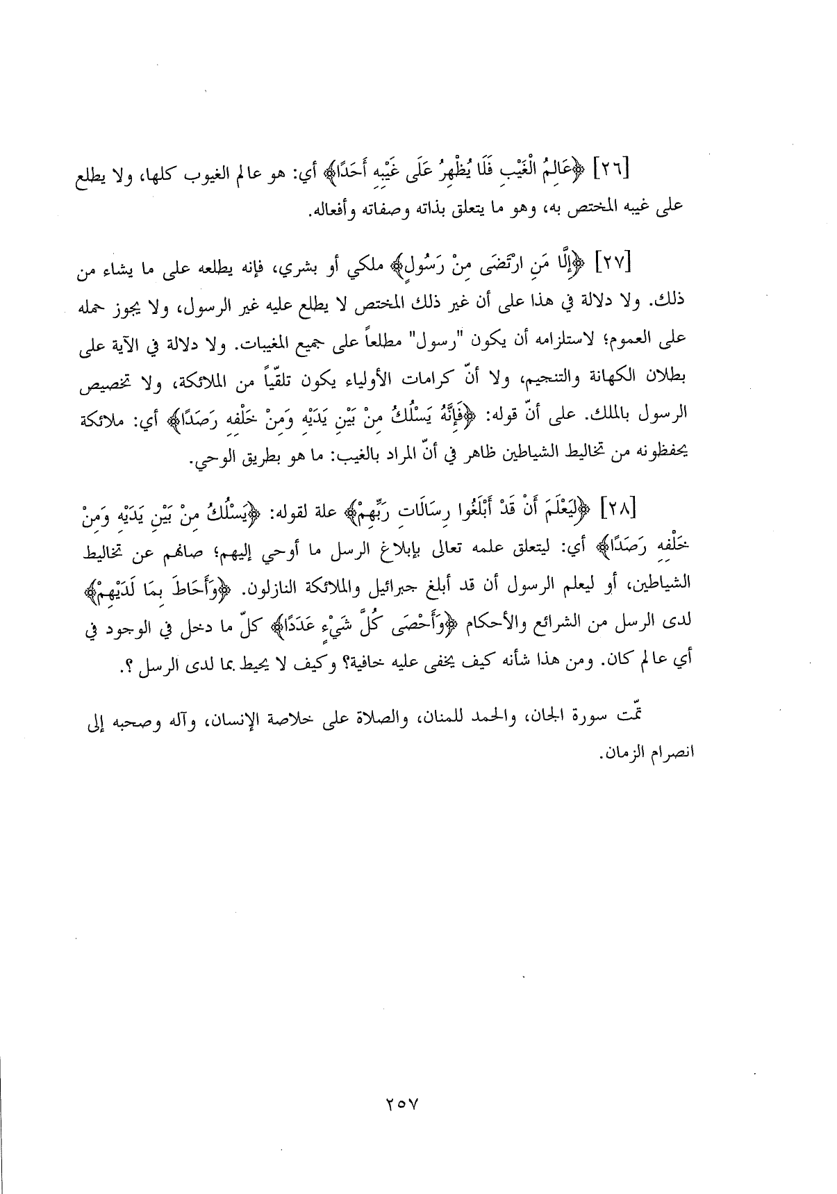 تمَّت سورة الجان، والحمد للمنان، والصلاة على خلاصة الإنسان، وآله وصحبه إلى انصرام الزمان.