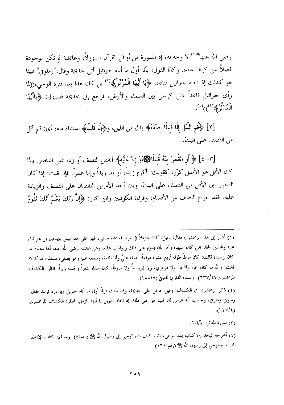 رضي اللَّه عنها " لا وجه له، إذ السورة من أوائل القرآن نزولاً، وعائشة لم تكن موجودة فضلاً عن كونها عنده. وكذا القول. بأنه أول ما أتاه جبرائيل أتى خديجة وقال: " زملوني " فبينا هو كذلك إذ ناداه جبرائيل فناداه: (يَا أَيُّهَا الْمُزَّمِّلُ) بل كان هذا بعد فترة الوحي، " لما رأي جبرائيل قاعداً على كرسي بين السماء والأرض، فرجع إلى خديجة فنزل: (يَا أَيُّهَا الْمُدَّثِّرُ) ".