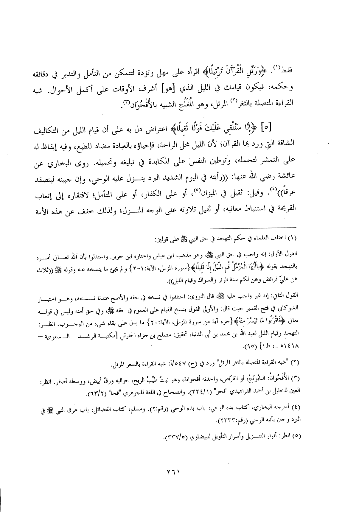 فقط. (وَرَتِّلِ الْقُرْآنَ تَرْتِيلًا) اقرأه على مهل وتؤدة لتتمكن من التأمل والتدبر في دقائقه وحكمه، فيكون قيامك في الليل الذي هو أشرف الأوقات على أكمل الأحوال. شبه القراءة المتصلة بالثغر المرتل، وهو المُفَلَّج الشبيه بالأُقْحُوَان.