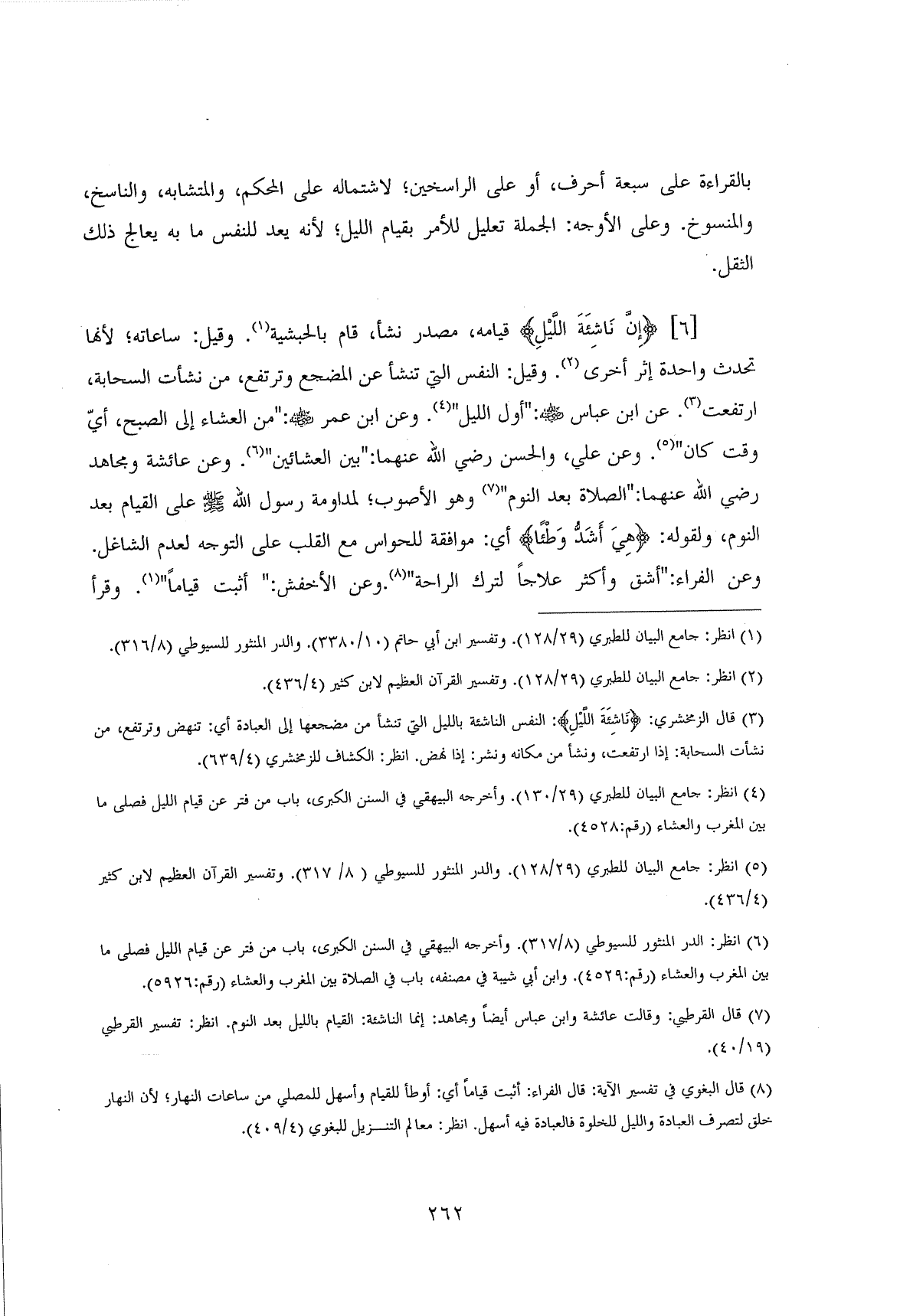 (إِنَّ نَاشِئَةَ اللَّيْلِ ... (6) قيامه، مصدر نشأ، قام بالحبشية. وقيل: ساعاته؛ لأنها تحدث واحدة إثر أخرى. وقيل: النفس التي تنشأ عن المضجع وترتفع، من نشأت السحابة، ارتفعت. عن ابن عباس - رضي الله عنهما -: " أول الليل ". وعن ابن عمر - رضي الله عنهما -: " من العشاء إلى الصبح، أيّ وقت كان ". وعن علي، والحسن رضي اللَّه عنهما: " بين العشائين "، وعن عائشة ومجاهد رضي اللَّه عنهما: " الصَّلاة بعد النوم " وهو الأصوب، لمداومة رسول اللَّه - صلى الله عليه وسلم - على القيام بعد النوم، ولقوله: (هِيَ أَشَدُّ وَطْئًا) أي: موافقة للحواس مع القلب على التوجه لعدم الشاغل. وعن الفراء: " أشق وأكثر علاجاً لترك الراحة ". وعن الأخفش: " أثبت قياماً ". وقرأ