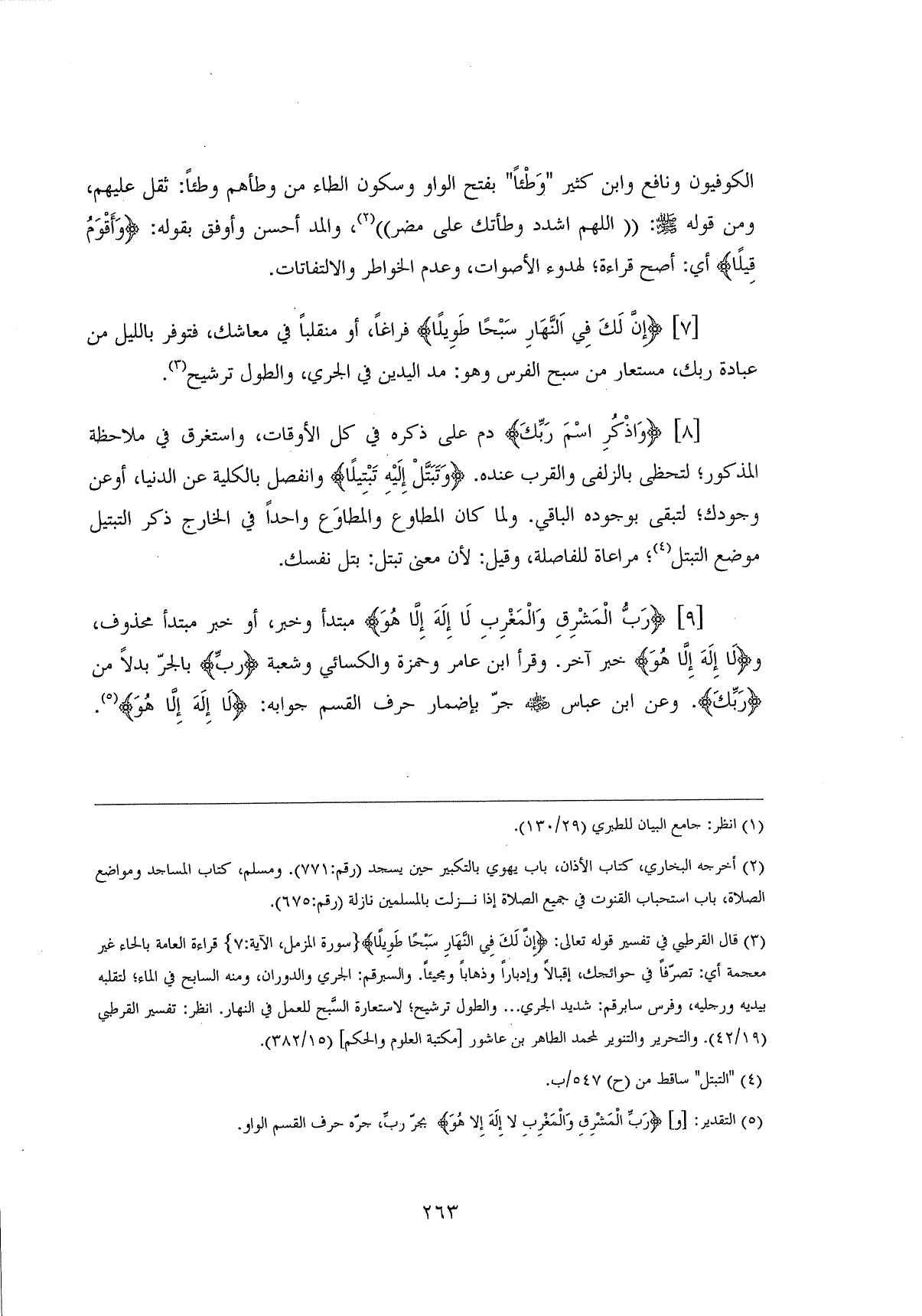 (وَاذْكُرِ اسْمَ رَبِّكَ ... (8) دم على ذكره في كل الأوقات، واستغرق في ملاحظة المذكور؛ لتحظى بالزلفى والقرب عنده. (وَتَبَتَّلْ إِلَيْهِ تَبْتِيلًا) وانفصل بالكلية عن الدنيا، أو عن وجودك؛ لتبقى بوجوده الباقي. ولما كان المطاوع والمطاوَع واحداً في الخارج ذكر التبتيل موضع التبتل؛ مراعاة للفاصلة، وقيل: لأن معنى تبتل: بتل نفسك.