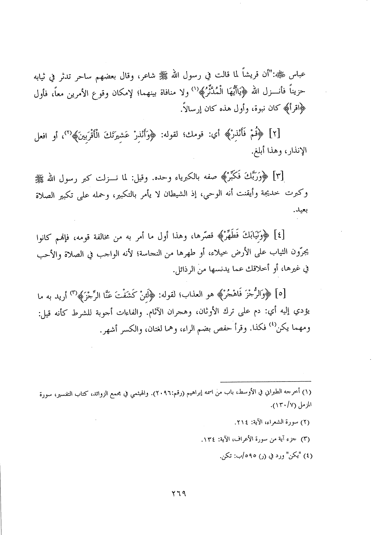 عباس - رضي الله عنهما -: أن قريشاً لما قالت في رسول اللَّه - صلى الله عليه وسلم - شاعر، وقال بعضهم ساحر تدثر في ثيابه حزيناً فأنزل اللَّه (يَا أَيُّهَا الْمُدَّثِّرُ) ولا منافاة بينهما؛ لإمكان وقوع الأمرين معاً، فأول (اقرأ) كان نبوة، وأول هذه كان إرسالاً.