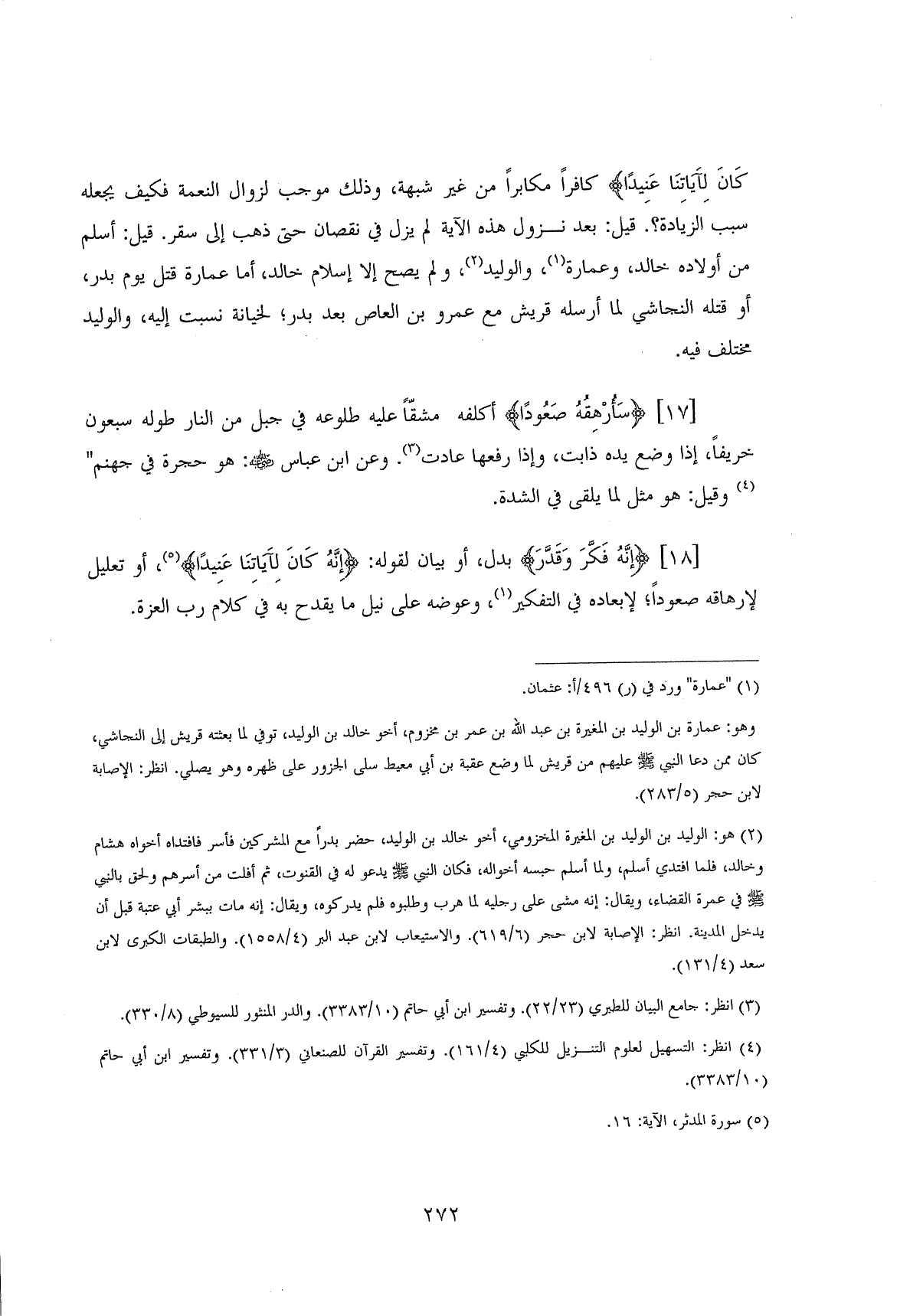 كَانَ لِآيَاتِنَا عَنِيدًا) كافراً مكابراً من غير شبهة، وذلك موجب لزوال النعمة فكيف يجعله سبب الزيادة؟. قيل: بعد نزول هذه الآية لم يزل في نقصان حتى ذهب إلى سقر. قيل: أسلم من أولاده خالد، وعمارة، والوليد، ولم يصح إلا إسلام خالد، أما عمارة قتل يوم بدر، أو قتله النجاشي لما أرسله قريش مع عمرو بن العاص بعد بدر؛ لخيانة نسبت إليه، والوليد مختلف فيه.