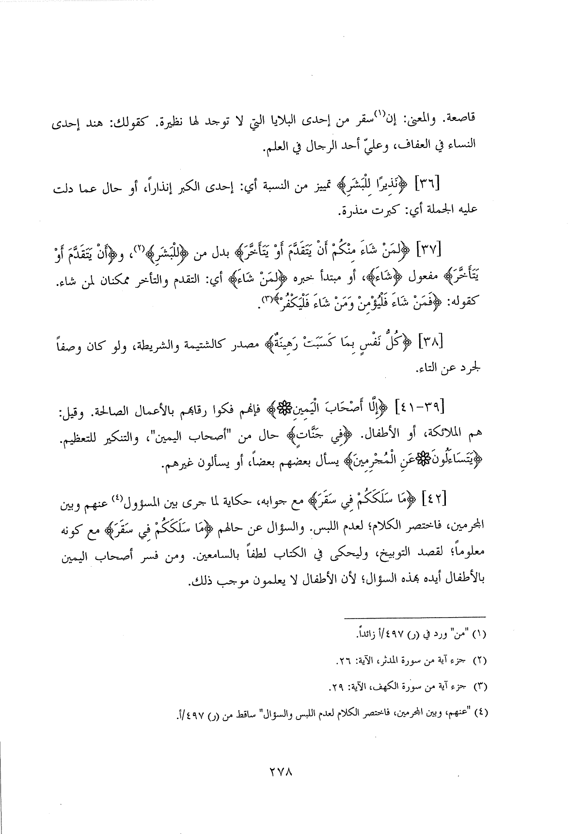 (مَا سَلَكَكُمْ فِي سَقَرَ (42) مع جوابه، حكاية لما جرى بين المسؤول عنهم وبين المجرمين، فاختصر الكلام؛ لعدم اللبس. والسؤال عن حالهم (مَا سَلَكَكُمْ فِي سَقَرَ) مع كونه معلوماً؛ لقصد التوبيخ، وليحكى في الكتاب لطفاً بالسامعين. ومن فسر أصحاب اليمين بالأطفال أيده بهذه السؤال؛ لأن الأطفال لا يعلمون موجب ذلك.