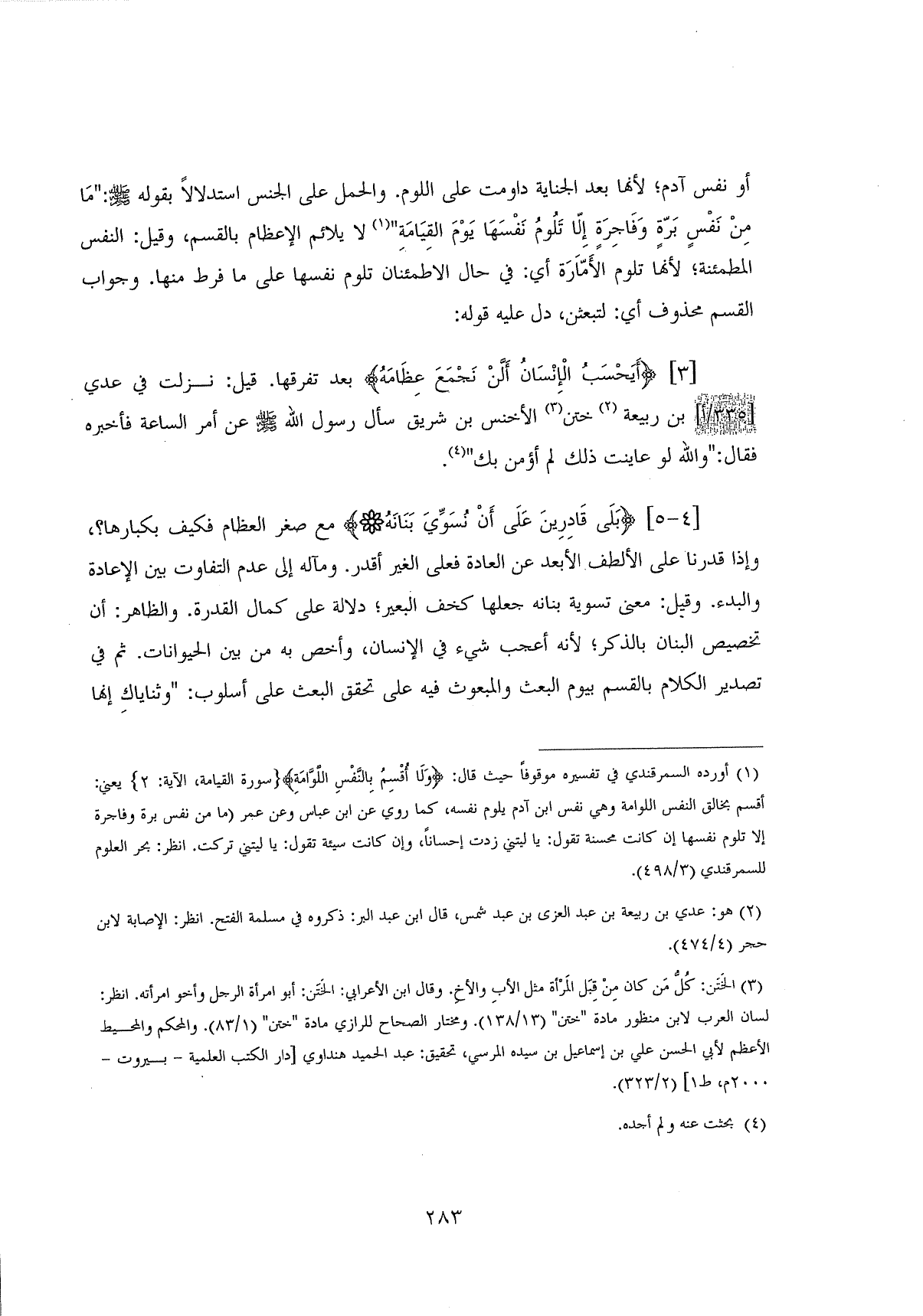 (أَيَحْسَبُ الْإِنْسَانُ أَلَّنْ نَجْمَعَ عِظَامَهُ (3) بعد تفرقها. قيل: نزلت في عدي بن ربيعة ختن الأخنس بن شريق سأل رسول اللَّه - صلى الله عليه وسلم - عن أمر الساعة فأخبره فقال: " واللَّه لو عاينت ذلك لم أومن بك ".