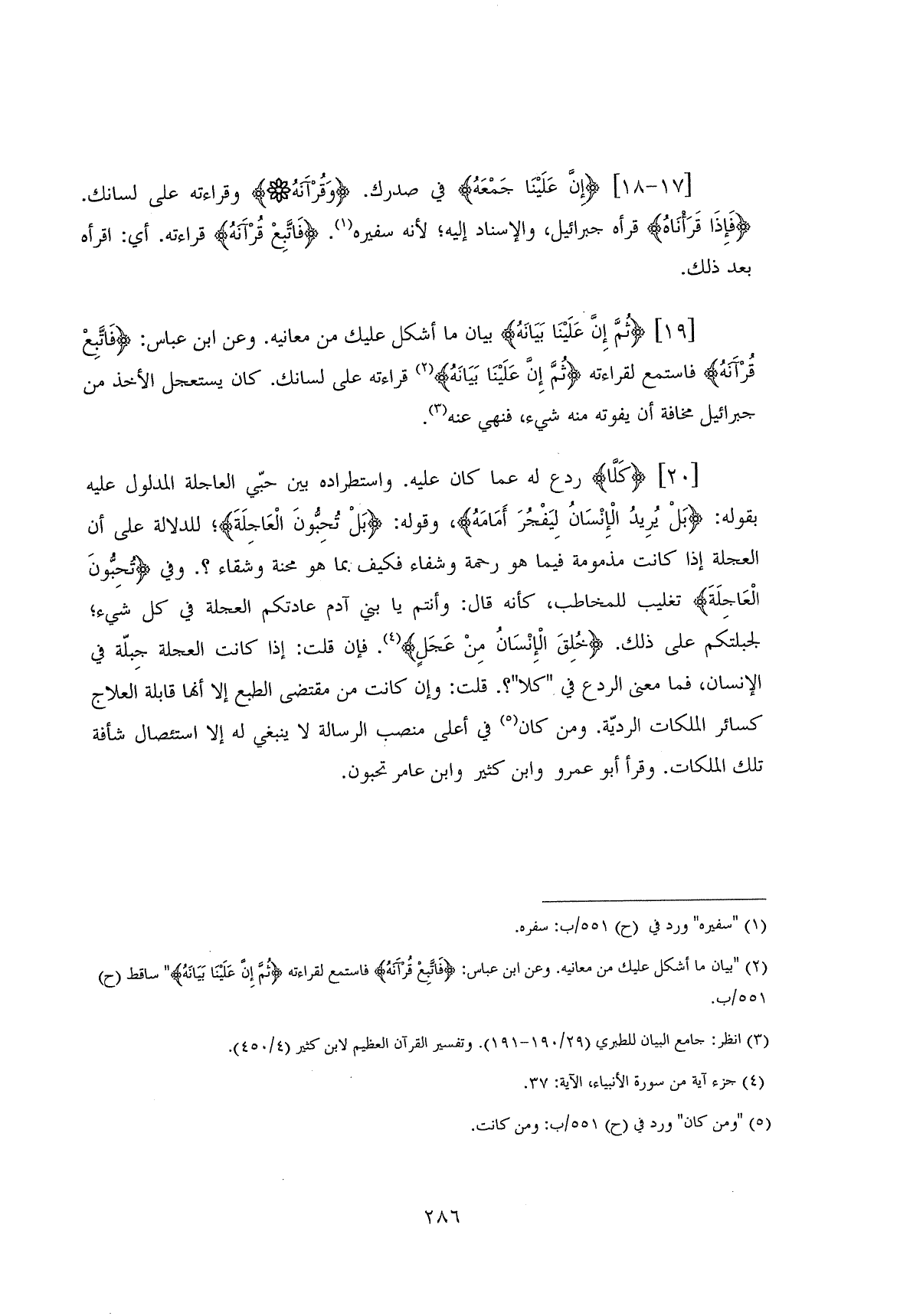 (ثُمَّ إِنَّ عَلَيْنَا بَيَانَهُ (19) بيان ما أشكل عليك من معانيه. وعن ابن عباس: (فَاتَّبِعْ قُرْآنَهُ) فاستمع لقراءته (ثُمَّ إِنَّ عَلَيْنَا بَيَانَهُ) قراءته على لسانك. كان يستعجل الأخذ من جبرائيل مخافة أن يفوته منه شيء، فنهي عنه.