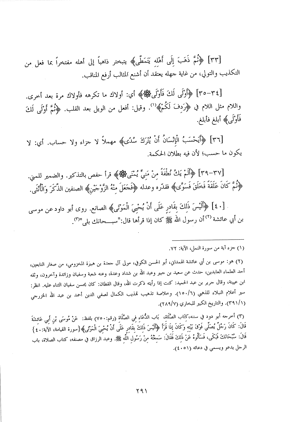 أَلَيْسَ ذَلِكَ بِقَادِرٍ عَلَى أَنْ يُحْيِيَ الْمَوْتَى (40) الصانع. روى أبو داود عن موسى بن أبي عائشة أن رسول اللَّه - صلى الله عليه وسلم - كان إذا قرأها قال: " " سبحانك بلى ".