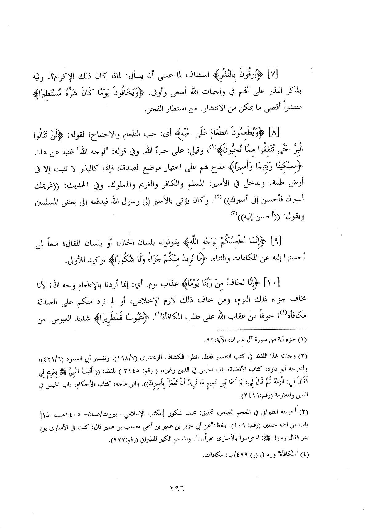 (إِنَّمَا نُطْعِمُكُمْ لِوَجْهِ اللَّهِ ... (9) يقولونه بلسان الحال، أو بلسان المقال؛ منعاً لمن أحسنوا إليه عن المكافآت والثناء، (لَا نُرِيدُ مِنْكُمْ جَزَاءً وَلَا شُكُورًا) توكيد للأولى.