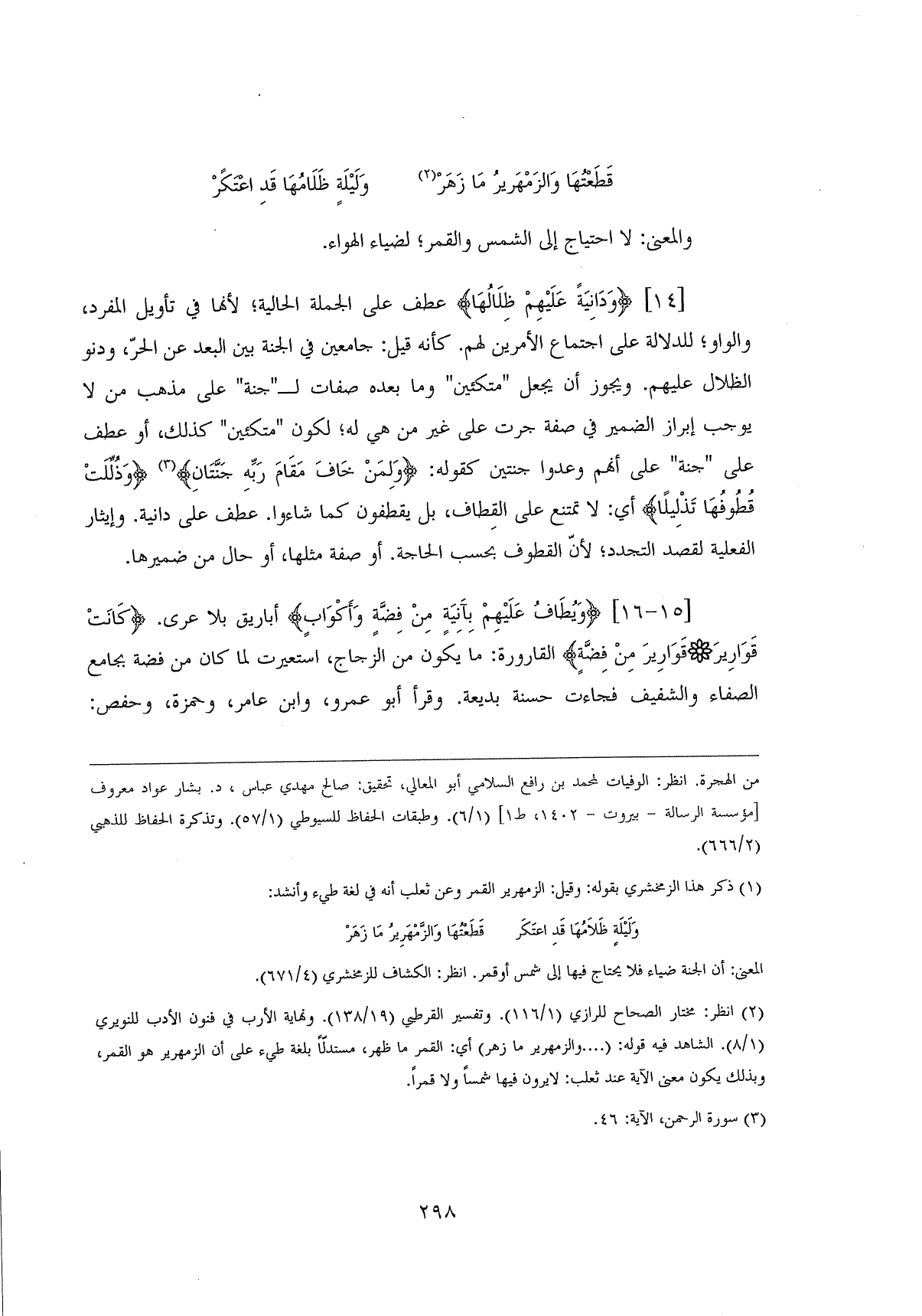 (وَدَانِيَةً عَلَيْهِمْ ظِلَالُهَا ... (14) عطف على الجملة الحالية؛ لأنَّها في تأويل المفرد، والواو؛ للدلالة على اجتماع الأمرين لهم. كأنه قيل: جامعين في الجنة بين البعد عن الحرّ، ودنو الظلال عليهم. ويجوز أن يجعل " متكئين " وما بعده صفات لـ " جنة " على مذهب من لا يوجب إبراز الضمير في صفة جرت على غير من هي له؛ لكون " متكئين " كذلك، أو عطف على " جنة " على أنهم وعدوا جنتين كقوله: (وَلِمَنْ خَافَ مَقَامَ رَبِّهِ جَنَّتَانِ) (وَذُلِّلَتْ قُطُوفُهَا تَذْلِيلًا) أي: لا تمتنع على القِطاف، بل يقطفون كما شاءوا. عطف على دانية. وإيثار الفعلية لقصد التجدد؛ لأنَّ القطوف بحسب الحاجة. أو صفة مثلها، أو حال من ضميرها.