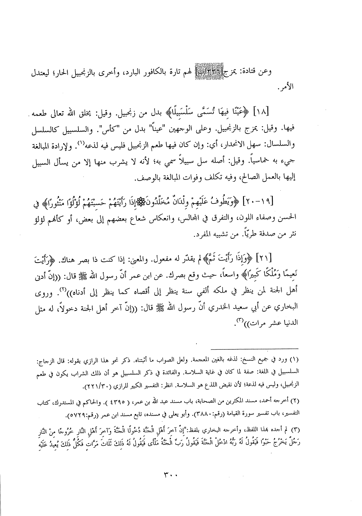 (وَإِذَا رَأَيْتَ ثَمَّ ... (20) لم يقدّر له مفعول. والمعنى. إذا كنت ذا بصر هناك. (رَأَيْتَ نَعِيمًا وَمُلْكًا كَبِيرًا) واسعاً، حيث وقع بصرك. عن ابن عمر أنَّ رسول اللَّه - صلى الله عليه وسلم - قال: " إنَّ أدنى أهل الجنة لمن ينظر في ملكه ألفي سنة ينظر إلى أقصاه كما ينظر إلى أدناه ". وروى البخاري عن أبي سعيد الخدري أنَّ رسول اللَّه - صلى الله عليه وسلم - قال: " إنَّ آخر أهل الجنة دخولاً، له مثل الدنيا عشر مرات ".