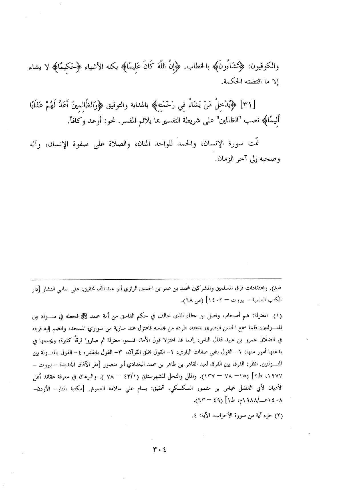 والكوفيون: (تَشَاءُونَ) بالخطاب. (إِنَّ اللَّهَ كَانَ عَلِيمًا) بكنه الأشياء (حَكِيمًا) لا يشاء إلا ما اقتضته الحكمة.