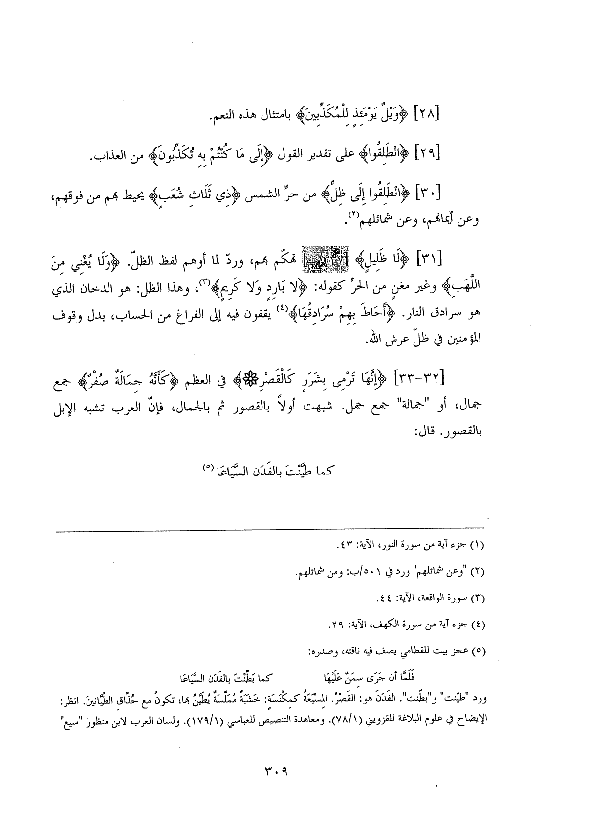 (إِنَّهَا تَرْمِي بِشَرَرٍ كَالْقَصْرِ (32) في العظم (كَأَنَّهُ جِمَالَتٌ صُفْرٌ (33) جمع جمال، أو " جمالة " جمع جمل. شبهت أولاً بالقصور ثم بالجمال، فإنَّ العرب تشبه الإبل بالقصور. قال: