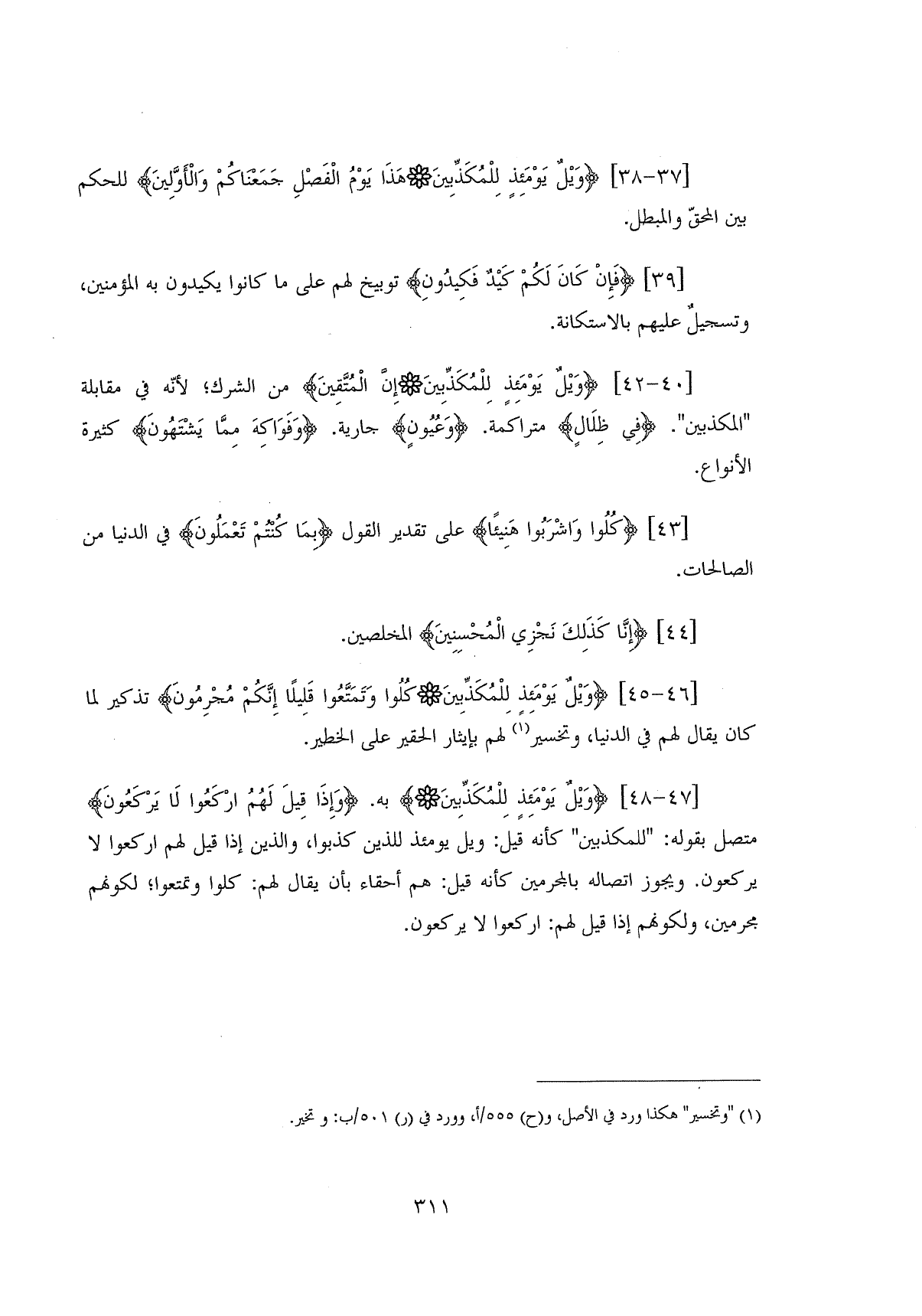 (وَيْلٌ يَوْمَئِذٍ لِلْمُكَذِّبِينَ (40) إِنَّ الْمُتَّقِينَ ... (41) من الشرك؛ لأنّه في مقابلة " المكذبين "، (فِي ظِلَالٍ) متراكمة. (وَعُيُونٍ) جارية. (وَفَوَاكِهَ مِمَّا يَشْتَهُونَ (42) كثيرة الأنواع.