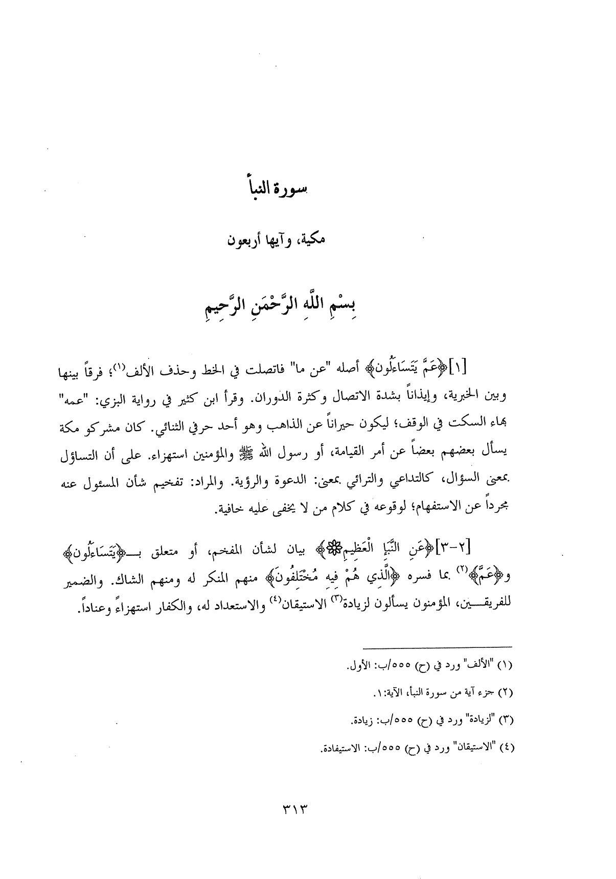 عَمَّ يَتَسَاءَلُونَ (1) أصله " عن ما " فاتصلت في الخط وحذف الألف؛ فرقاً بينها وبين الخبرية، وإيذاناً بشدة الاتصال وكثرة الدوران. وقرأ ابن كثير في رواية البزي: " عمَّه " بهاء السكت في الوقف؛ ليكون حيراناً عن الذاهب وهو أحد حرفي الثنائي. كان مشركو مكة يسأل بعضهم بعضاً عن أمر القيامة، أو رسول اللَّه - صلى الله عليه وسلم - والمؤمنين استهزاء. على أن التساؤل بمعنى السؤال، كالتداعي والترائي بمعنى: الدعوة والرؤية. والمراد: تفخيم شأن المسئول عنه مجرداً عن الاستفهام؛ لوقوعه في كلام من لا يخفى عليه خافية.