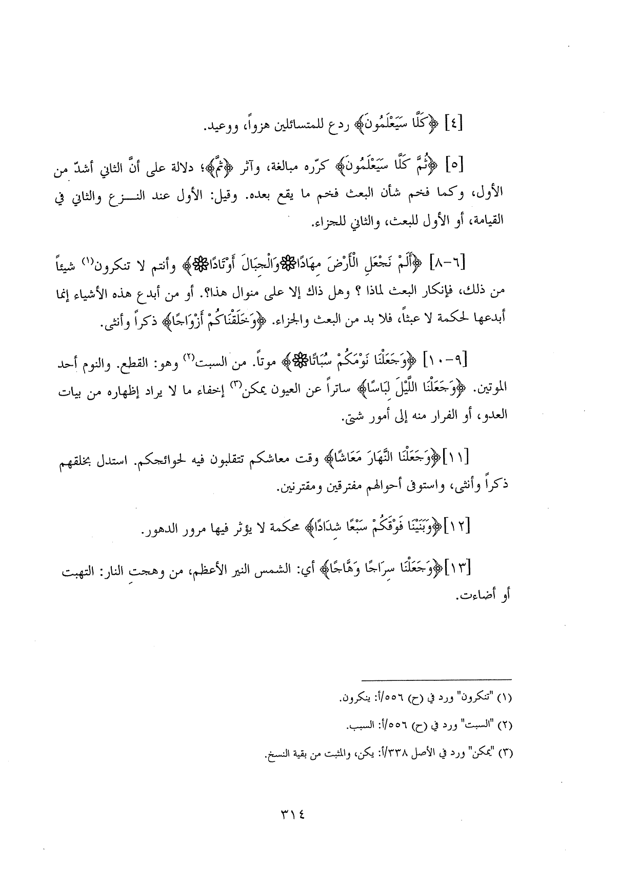 (وَجَعَلْنَا نَوْمَكُمْ سُبَاتًا (9) موتاً. منْ السبت وهو: القطع. والنوم أحد الموتين. (وَجَعَلْنَا اللَّيْلَ لِبَاسًا (10) ساتراً عن العيون يمكن إخفاء ما لا يراد إظهاره من بيات العدو، أو الفرار منه إلى أمور شتى.