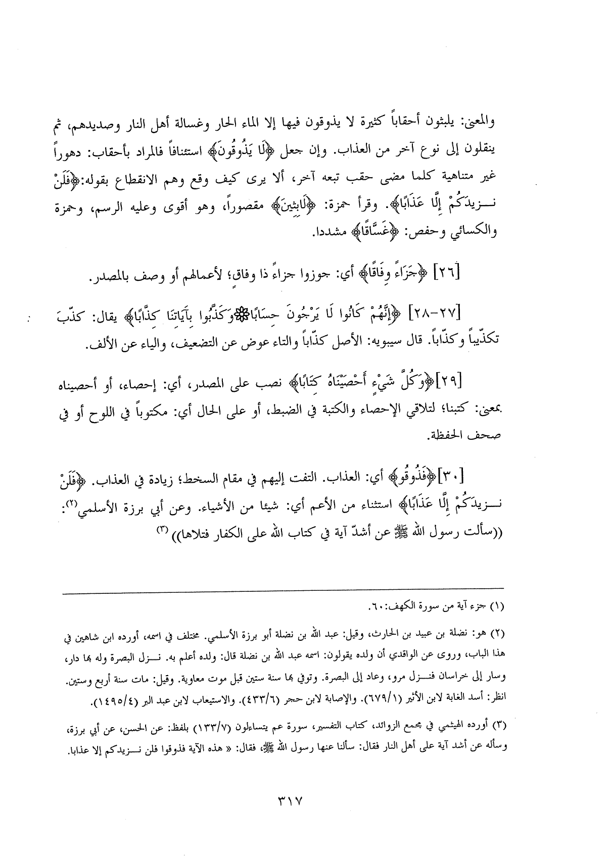 (فَذُوقُوا ... (30) أي: العذاب. التفت إليهم في مقام السخط؛ زيادة في العذاب. (فَلَنْ نَزِيدَكُمْ إِلَّا عَذَابًا) استثناء من الأعم أي: شيئا من الأشياء. وعن أبي برزة الأسلمي: " سألت رسول اللَّه - صلى الله عليه وسلم - عن أشدّ آية في كتاب اللَّه على الكفار فتلاها ".