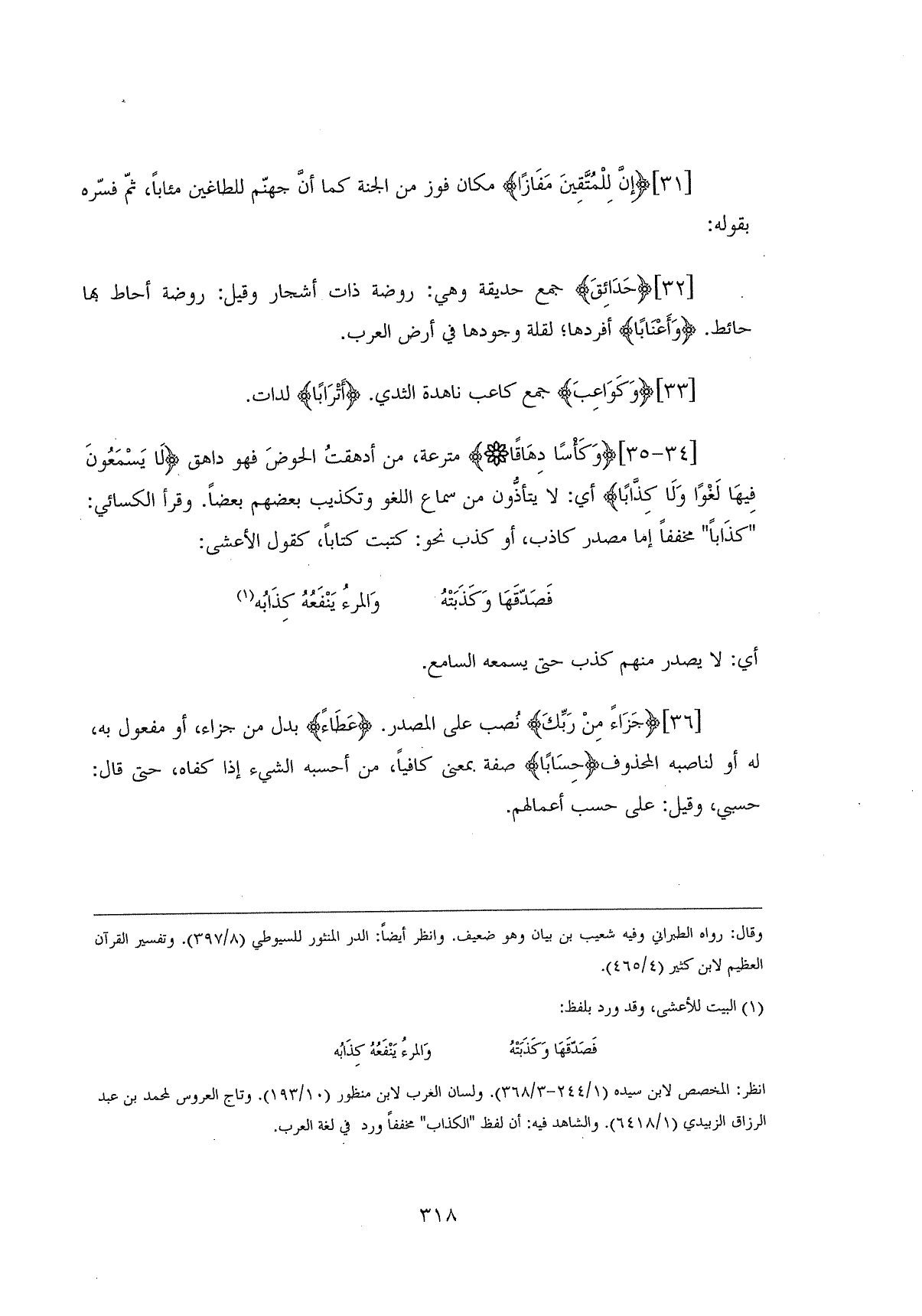 (وَكَأْسًا دِهَاقًا (34) مترعة، من أدهقتُ الحوضَ فهو داهق (لَا يَسْمَعُونَ فِيهَا لَغْوًا وَلَا كِذَّابًا (35) أي: لا يتأذُّون من سماع اللغو وتكذيب بعضهم بعضاً. وقرأ الكسائي: " كِذَاباً " مخففاً إما مصدر كاذب، أو كذب نحو: كتبت كتاباً، كقول الأعشى: