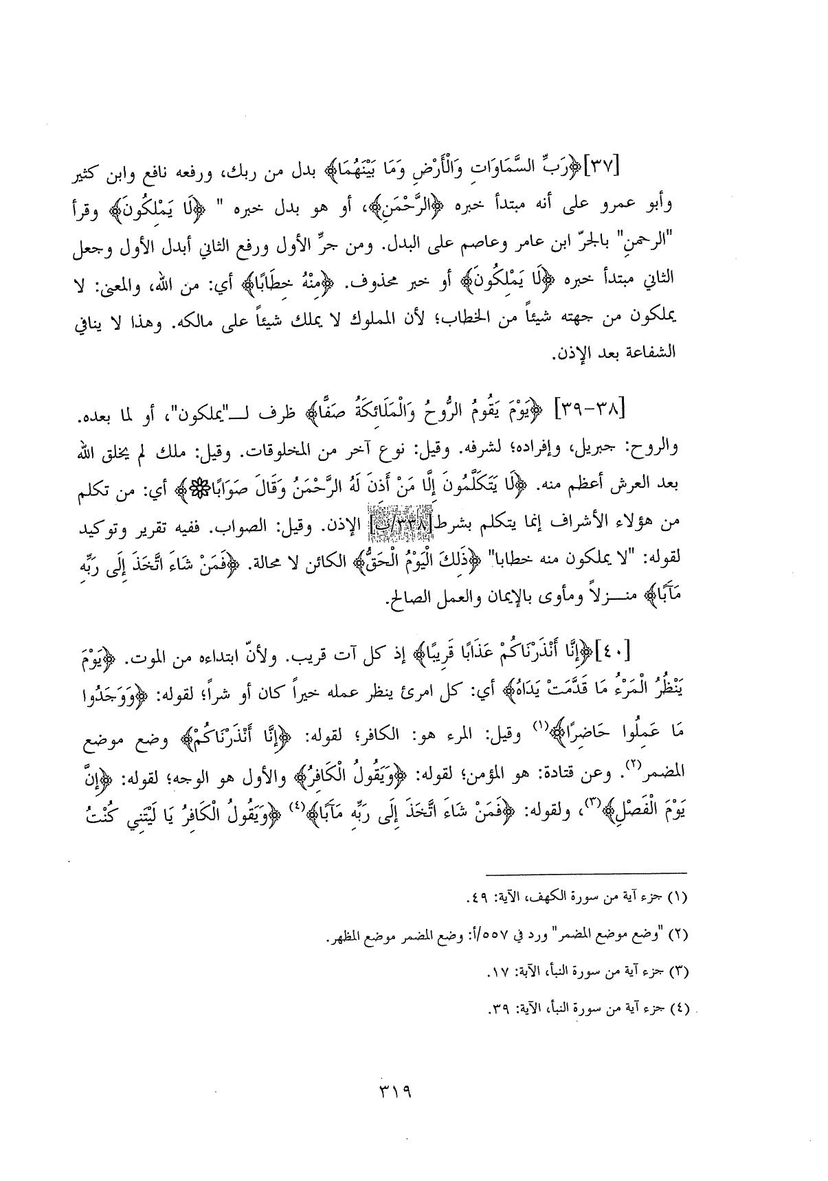 (رَبِّ السَّمَاوَاتِ وَالْأَرْضِ وَمَا بَيْنَهُمَا ... (37) بدل من ربك، ورفعه نافع وابن كثير وأبو عمرو على أنه مبتدأ خبره (الرَّحْمَنُ)، أو هو بدل خبره (لَا يَمْلِكُونَ) وقرأ " الرحمنِ " بالجرّ ابن عامر وعاصم على البدل. ومن جرِّ الأول ورفع الثاني أبدل الأول وجعل الثاني مبتدأ خبره (لَا يَمْلِكُونَ) أو خبر محذوف. (مِنْهُ خِطَابًا) أي: من اللَّه، والمعنى: لا يملكون من جهته شيئاً من الخطاب؛ لأن المملوك لا يملك شيئاً على مالكه. وهذا لا ينافي الشفاعة بعد الإذن.