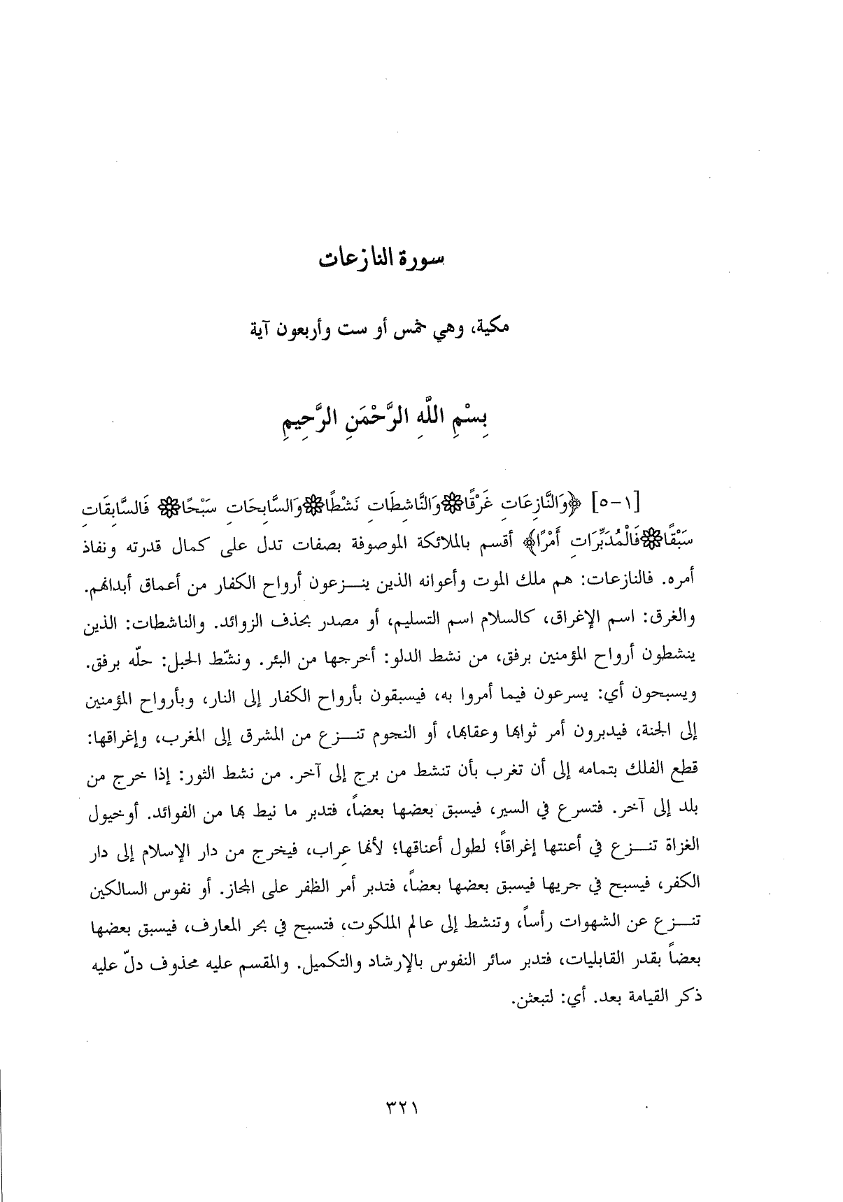 (وَالنَّازِعَاتِ غَرْقًا (1) وَالنَّاشِطَاتِ نَشْطًا (2) وَالسَّابِحَاتِ سَبْحًا (3) فَالسَّابِقَاتِ سَبْقًا (4) فَالْمُدَبِّرَاتِ أَمْرًا (5) أقسم بالملائكة الموصوفة بصفات تدل على كمال قدرته ونفاذ أمره. فالنازعات: هم ملك الموت وأعوانه الذين ينزعون أرواح الكفار من أعماق أبدانهم. والغرق: اسم الإغراق، كالسلام اسم التسليم، أو مصدر بحذف الزوائد. والناشطات: الذين ينشطون أرواح المؤمنين برفق، من نشط الدلو: أخرجها من البئر. ونشّط الحبل: حلّه برفق. ويسبحون أي: يسرعون فيما أصروا به، فيسبقون بأرواح الكفار إلى النار، وبأرواح المؤمنين إلى الجنة، فيدبرون أمر ثوابها وعقابها، أو النجوم تنزع من المشرق إلى المغرب، وإغراقها: قطع الفلك بتمامه إلى أن تغرب بأن تنشط من برج إلى آخر. من نشط الثور: إذا خرج من بلد إلى آخر. فتسرع في السير، فيسبق بعضها بعضاً، فتدبر ما نيط بها من الفوائد. أو خيول الغزاة تنزع في أعنتها إغراقاً؛ لطول أعناقها؛ لأنها عِراب، فيخرج من دار الإسلام إلى دار الكفر، فيسبح في جريها فيسبق بعضها بعضاً، فتدبر أمر الظفر على المجاز، أو نفوس السالكين تنزع عن الشهوات رأساً، وتنشط إلى عالم الملكوت، فتسبع في بحر المعارف، فيسبق بعضها بعضاً بقدر القابليات، فتدبر سائر النفوس بالإرشاد والتكميل. والمقسم عليه محذوف دلّ عليه ذكر القيامة بعد. أي: لتبعثن.