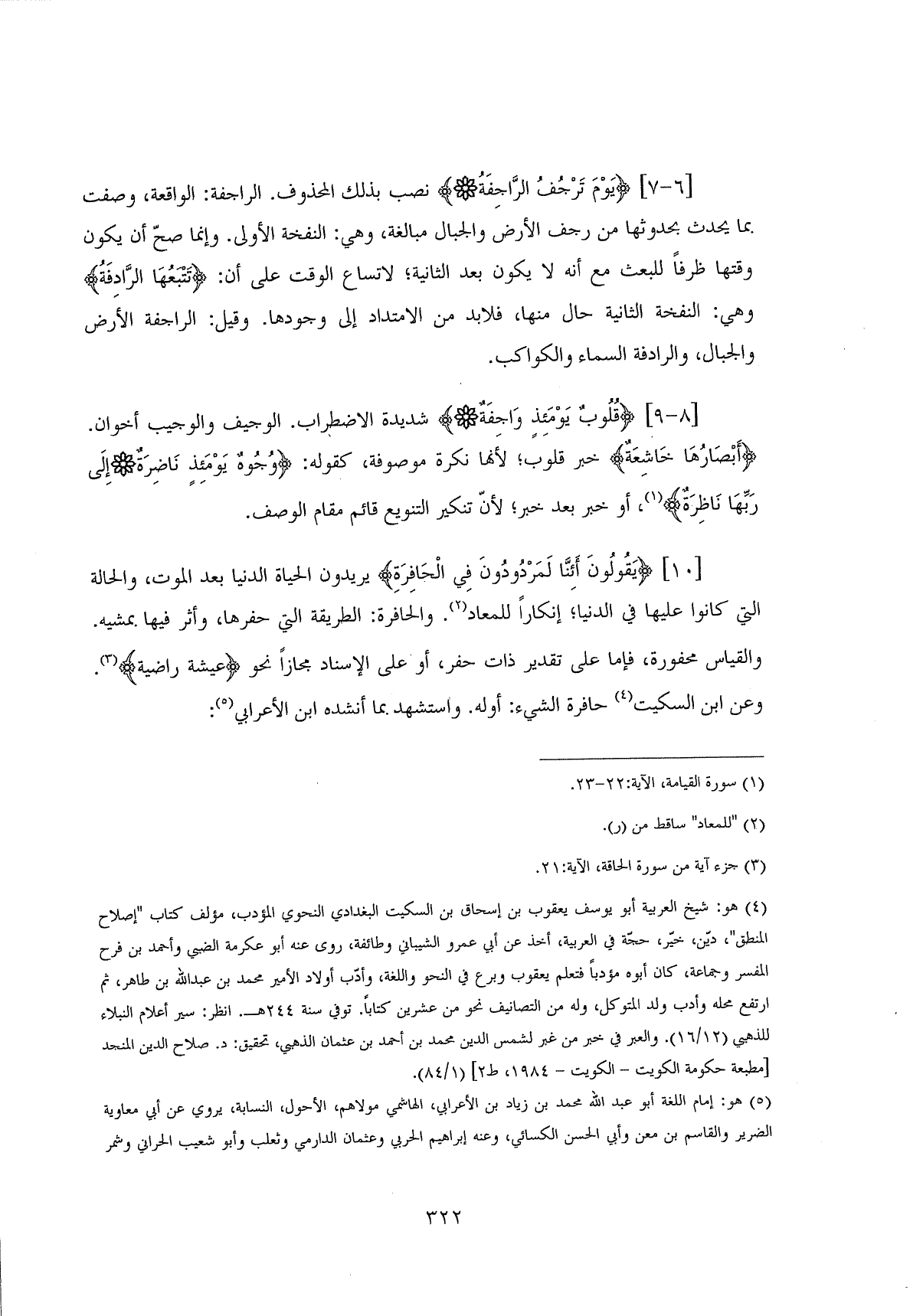 (يَوْمَ تَرْجُفُ الرَّاجِفَةُ (6) نصب بذلك المحذوف. الراجفة: الواقعة، وصفت بما يحدث بحدوثها من رجف الأرض والجبال مبالغة، وهي: النفخة الأولى. وإنما صحّ أن يكون وقتها ظرفاً للبعث مع أنه لا يكون بعد الثانية؛ لاتساع الوقت على أن: (تَتْبَعُهَا الرَّادِفَةُ (7) وهي: النفخة الثانية حال منها، فلابد من الامتداد إلى وجودها. وقيل: الراجفة الأَرض والجبال، والرادفة السماء والكواكب.