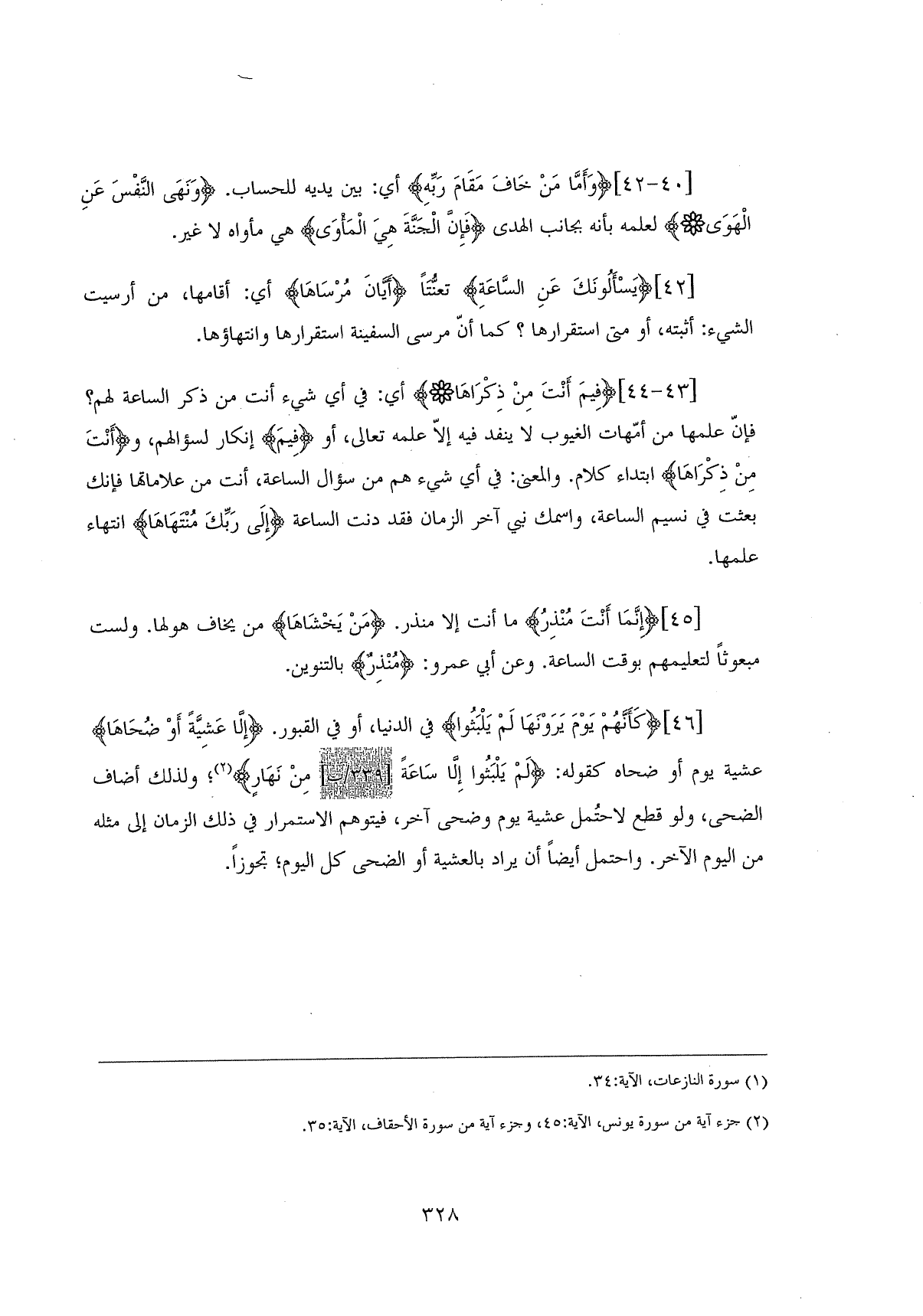 (كَأَنَّهُمْ يَوْمَ يَرَوْنَهَا لَمْ يَلْبَثُوا ... (46) في الدنيا، أو في القبور. (إِلَّا عَشِيَّةً أَوْ ضُحَاهَا) عشية يوم أو ضحاه كقوله: (لَمْ يَلْبَثُوا إِلَّا سَاعَةً مِنْ نَهَارٍ)؛ ولذلك أضاف الضحى، ولو قطع لاحتُمل عشية يوم وضحى آخر، فيتوهم الاستمرار في ذلك الزمان إلى مثله من اليوم الآخر. واحتمل أيضاً أن يراد بالعشية أو الضحى كل اليوم؛ تجوزاً.