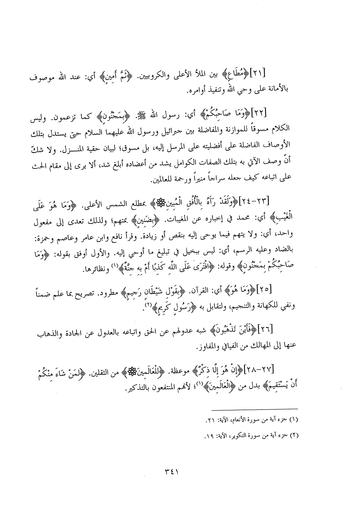 (وَمَا صَاحِبُكُمْ ... (22) أي: رسول اللَّه - صلى الله عليه وسلم -. (بِمَجْنُونٍ) كما تزعمون. [وليس الكلام مسوقاً للموازنة والمفاضلة بين جبرائيل ورسول اللَّه عليهما السلام حتى يستدل بتلك الأوصاف الفاضلة على أفضليته على المرسل إليه، بل مسوق؛ لبيان حقية المنزل. ولا شكّ أنَّ وصف الآتي به بتلك الصفات الكوامل يشد من أعضاده أبلغ شد، ألا يرى إلى مقام الحث على اتباعه كيف جعله سراجاً منيراً ورحمة للعالمين].