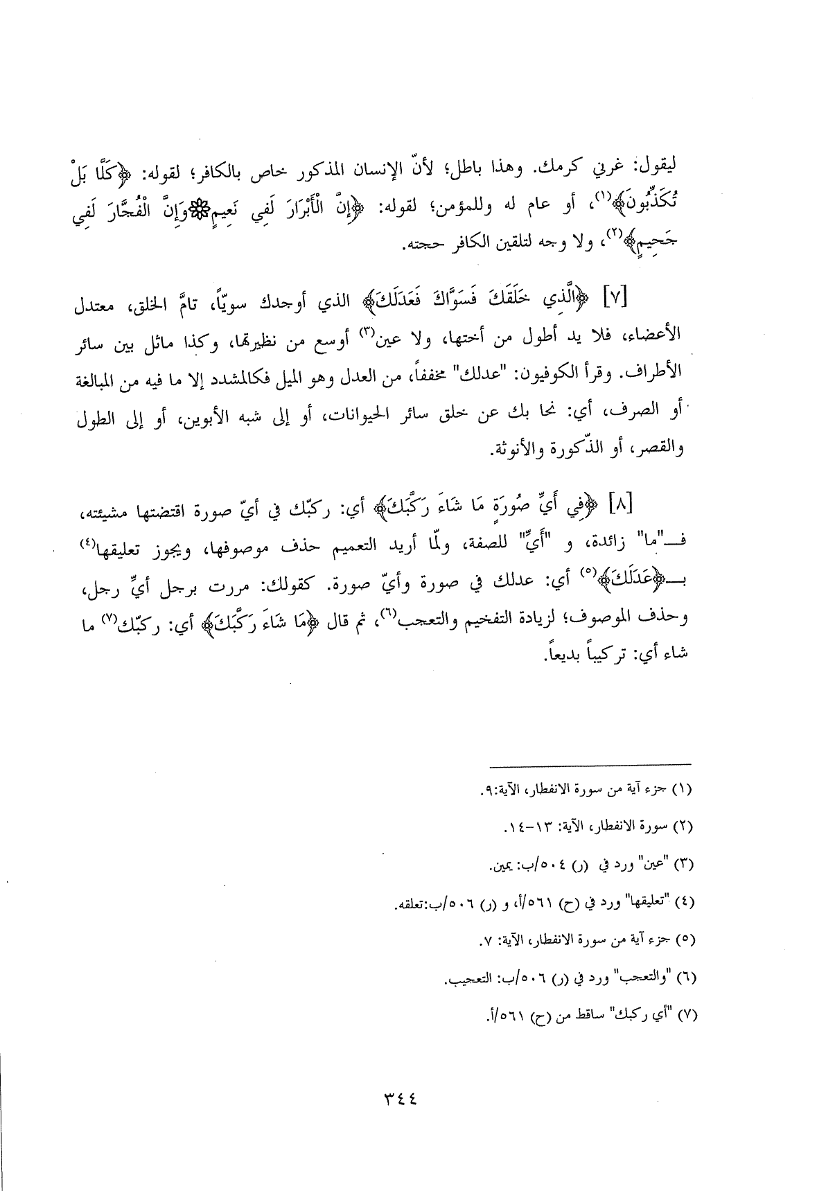 (الَّذِي خَلَقَكَ فَسَوَّاكَ فَعَدَلَكَ (7) الذي أوجدك سويّاً، تامَّ الخلق، معتدل الأعضاء، فلا يد أطول من أختها، ولا عين أوسع من نظيرتها، وكذا ماثل بين سائر الأطراف. وقرأ الكوفيون: " عَدَلَكَ " مخففاً، من العدل وهو الميل فكالمشدد إلا ما فيه من المبالغة أو الصرف، أي: نحا بك عن خلق سائر الحيوانات، أو إلى شبه الأبوين، أو إلى الطول والقصر، أو الذُّكورة والأنوثة.