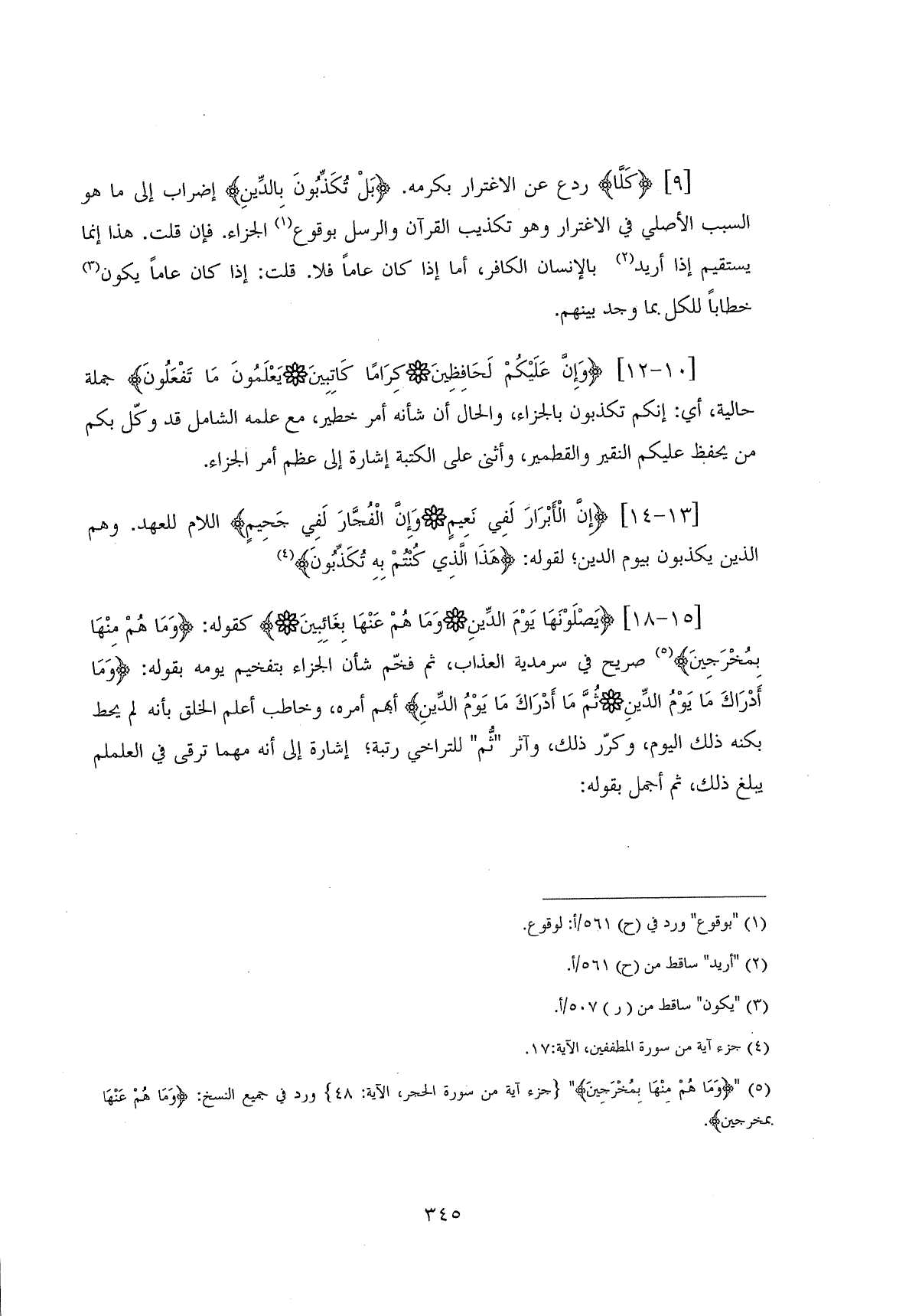 (يَصْلَوْنَهَا يَوْمَ الدِّينِ (15) وَمَا هُمْ عَنْهَا بِغَائِبِينَ (16) كقوله: (وَمَا همْ منهَا بمُخرَجِين) صريح في سرمدية العذاب، ثمّ فخّم شأن الجزاء بتفخيم يومه بقوله: (وَمَا أَدْرَاكَ مَا يَوْمُ الدِّينِ (17) ثُمَّ مَا أَدْرَاكَ مَا يَوْمُ الدِّينِ (18) أبهم أمره، وخاطب أعلم الخلق بأنه لم يحط بكنه ذلك اليوم، وكرّر ذلك، وآثر " ثم " للتراخي رتبة؛ إشارة إلى أنه مهما ترقى في العلم لم يبلغ ذلك، ثم أجمل بقوله: