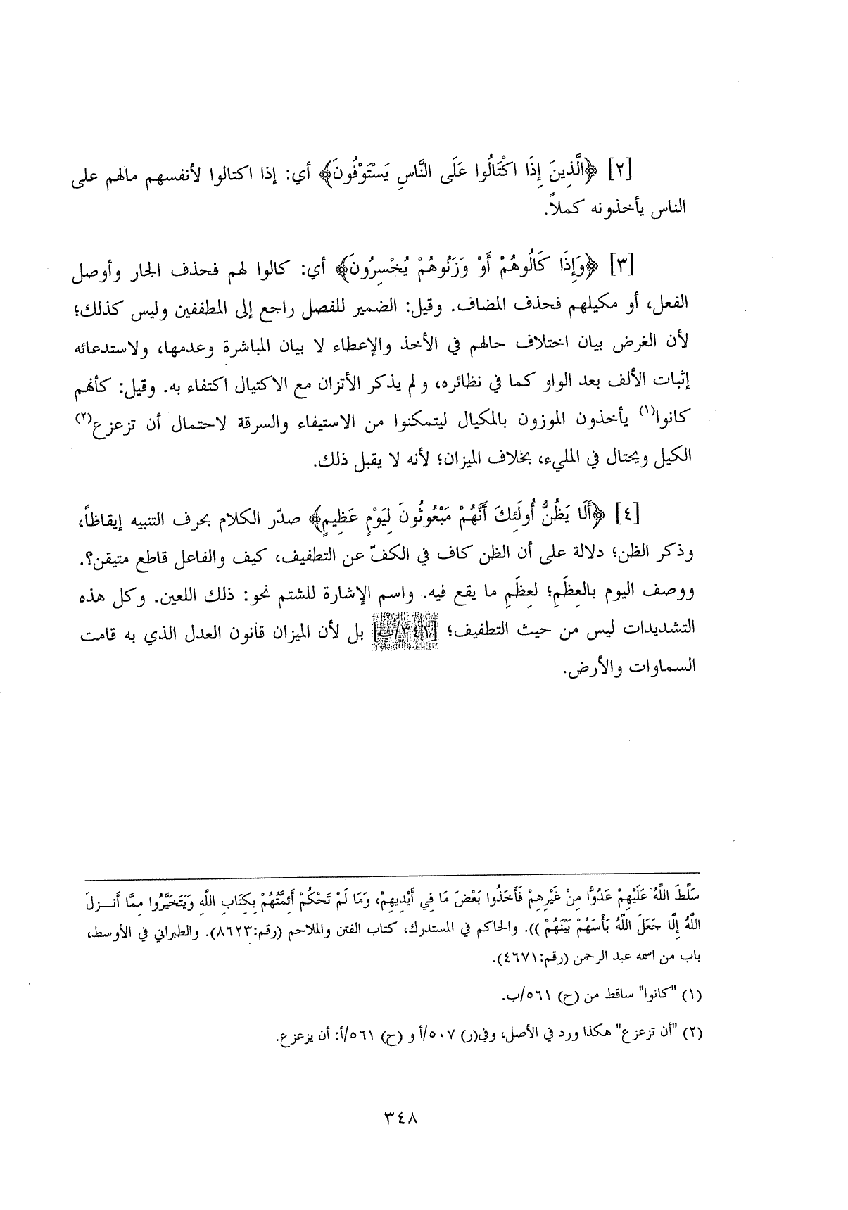 وَإِذَا كَالُوهُمْ أَوْ وَزَنُوهُمْ يُخْسِرُونَ (3) أي: كالوا لهم فحذف الجار وأوصل الفعل، أو مكيلهم فحذف المضاف. وقيل: الضمير للفصل راجع إلى المطففين وليس كذلك؛ لأن الغرض بيان اختلاف حالهم في الأخذ والإعطاء لا بيان المباشرة وعدمها، ولاستدعائه إثبات الألف بعد الواو كما في نظائره، ولم يذكر الاتزان مع الاكتيال اكتفاء به. وقيل. كأنهم كانوا يأخذون الموزون بالمكيال ليتمكنوا من الاستيفاء والسرقة لاحتمال أن تزعزع الكيل ويحتال في المليء، بخلاف الميزان؛ لأنه لا يقبل ذلك.