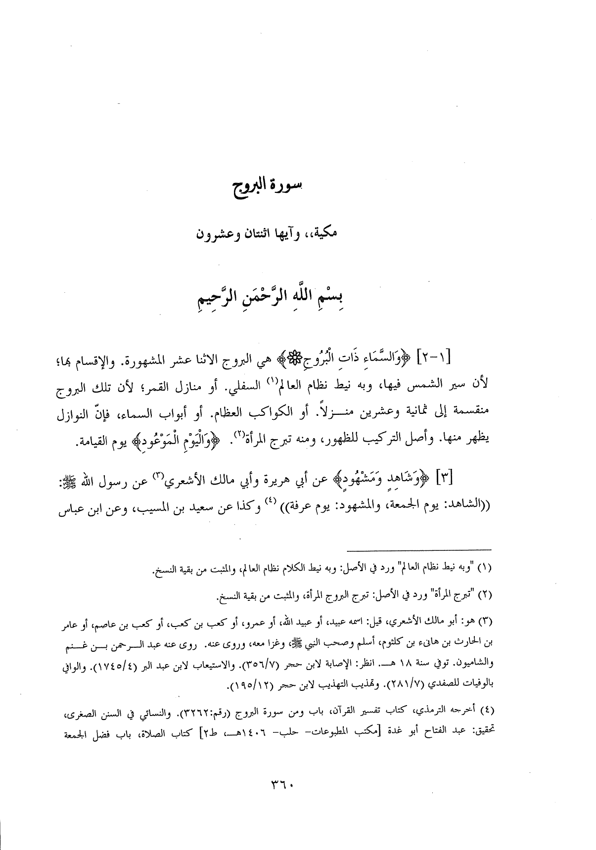 (وَالسَّمَاءِ ذَاتِ الْبُرُوجِ (1) هي البروج الاثنا عشر المشهورة. والإقسام بها؛ لأن سير الشمس فيها، وبه نيط نظام العالم السفلي. أو منازل القمر؛ لأن تلك البروج منقسمة إلى ثمانية وعشرين منزلاً. أو الكواكب العظام. أو أبواب السماء، فإنَّ النوازل يظهر منها. وأصل التركيب للظهور، ومنه تبرج المرأة. (وَالْيَوْمِ الْمَوْعُودِ (2) يوم القيامة.