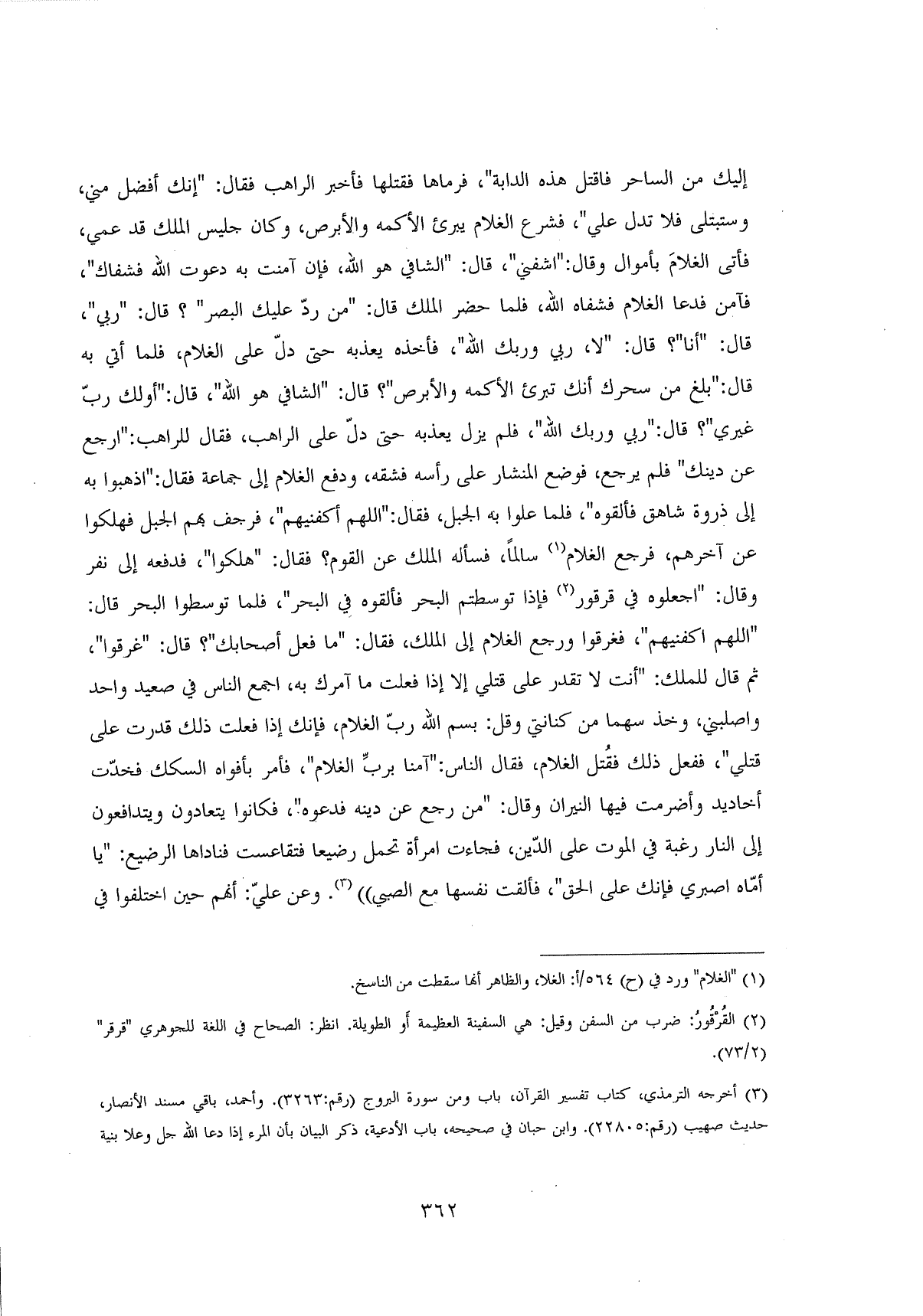 إليك من الساحر فاقتل هذه الدابة "، فرماها فقتلها فأخبر الراهب فقال: " إنك أفضل مني، وستبتلى فلا تدل عليَّ "، فشرع الغلام يبرئ الأكمه والأبرص، وكان جليس الملك قد عمي، فأتى الغلامَ بأموال وقال: " اشفني "، قال. " الشافي هو اللَّه، فإن آمنت به دعوت اللَّه فشفاك "، فآمن فدعا الغلام فشفاه اللَّه، فلما حضر الملك قال. " من ردّ عليك البصر "؟ قال: " ربي "، قال: " أنا "؟ قال: " لا، ربي وربك اللَّه "، فأخذه يعذبه حتى دل على الغلام، فلما أتي به قال: " بلغ من سحرك أنك تبرئ الأكمه والأبرص "؟ قال: " الشافي هو اللَّه "، قال: " أولك ربٌّ غيري "؟ قال: " ربي وربك اللَّه "، فلم يزل يعذبه حتى دلّ على الراهب، فقال للراهب: " ارجع عن دينك " فلم يرجع، فوضع المنشار على رأسه فشقه، ودفع الغلام إلى جماعة فقال: " اذهبوا به إلى ذروة شاهق فألقوه "، فلما علوا به الجبل، فقال: " اللَّهم أكفنيهم "، فرجف بهم الجبل فهلكوا عن آخرهم، فرجع الغلام سالماً، فسأله الملك عن القوم؟ فقال: " هلكوا "، فدفعه إلى نفر وقال: " اجعلوه في قرقور " فإذا توسطتم البحر فألقوه في البحر "، فلما توسطوا البحر قال: " اللَّهم اكفنيهم "، فغرقوا ورجع الغلام إلى الملك، فقال: " ما فعل أصحابك "؟ قال: " غرقوا "، ثم قال للملك: " أنت لا تقدر على قتلي إلا إذا فعلت ما آمرك به، اجمع الناس في صعيد واحد واصلبني، وخذ سهمًا من كنانتي وقل: بسم اللَّه ربِّ الغلام، فإنك إذا فعلت ذلك قدرت على قتلي "، ففعل ذلك فقُتل الغلام، فقال الناس: " آمنا بربِّ الغلام " فأمر بأفواه السكك فخدّت أخاديد وأضرمت فيها النيران وقال: " من رجع عن دينه فدعوه "، فكانوا يتعادون ويتدافعون إلى النار رغبة في الموت على الدِّين، فجاءت امرأة تحمل رضيعا فتقاعست فناداها الرضيع: " يا أمِّاه اصبري فإنك على الحق "، فألقت نفسها مع الصبي ". وعن عليٍّ: أنهم حين اختلفوا في