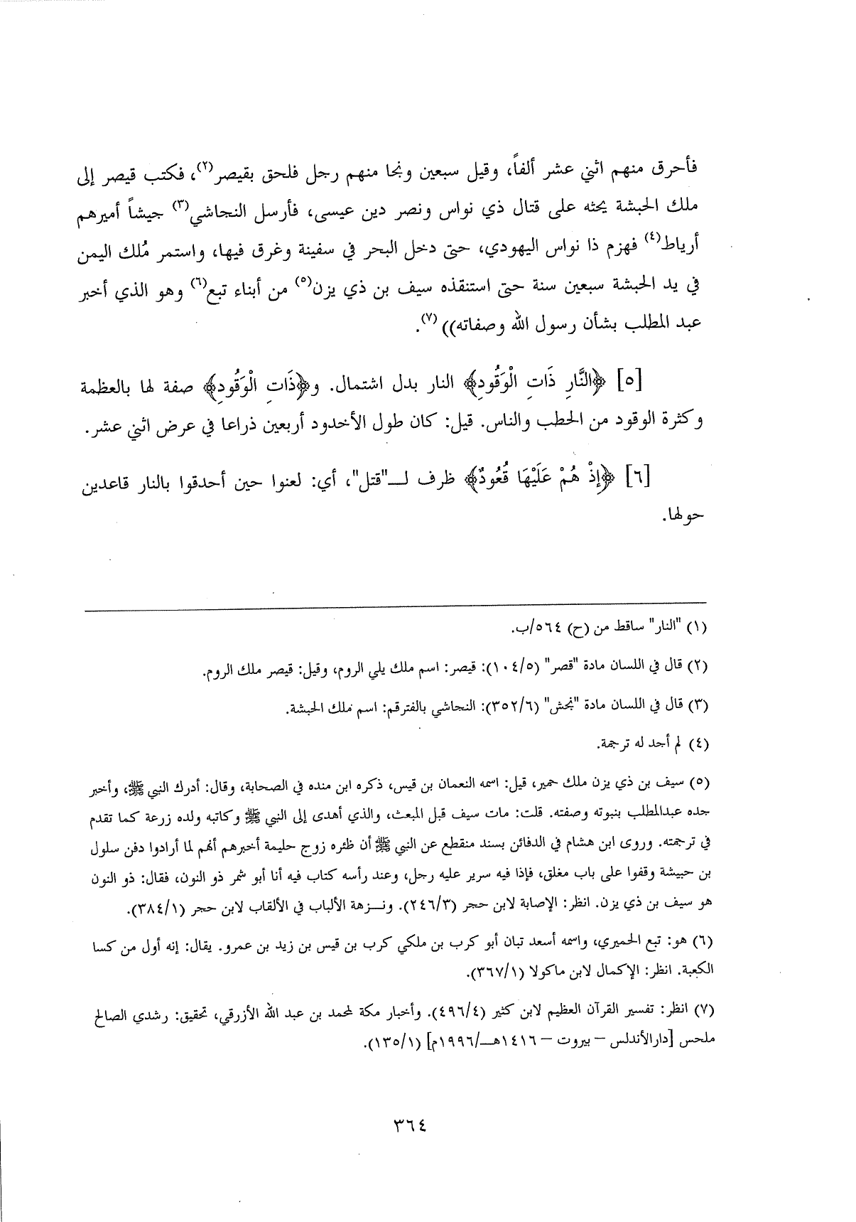 (النَّارِ ذَاتِ الْوَقُودِ (5) النار بدل اشتمال. و (ذَاتِ الْوَقُودِ) صفة لها بالعظمة وكثرة الوقود من الحطب والناس. قيل: كان طول الأخدود أربعين ذراعاً في عرض اثني عشر.