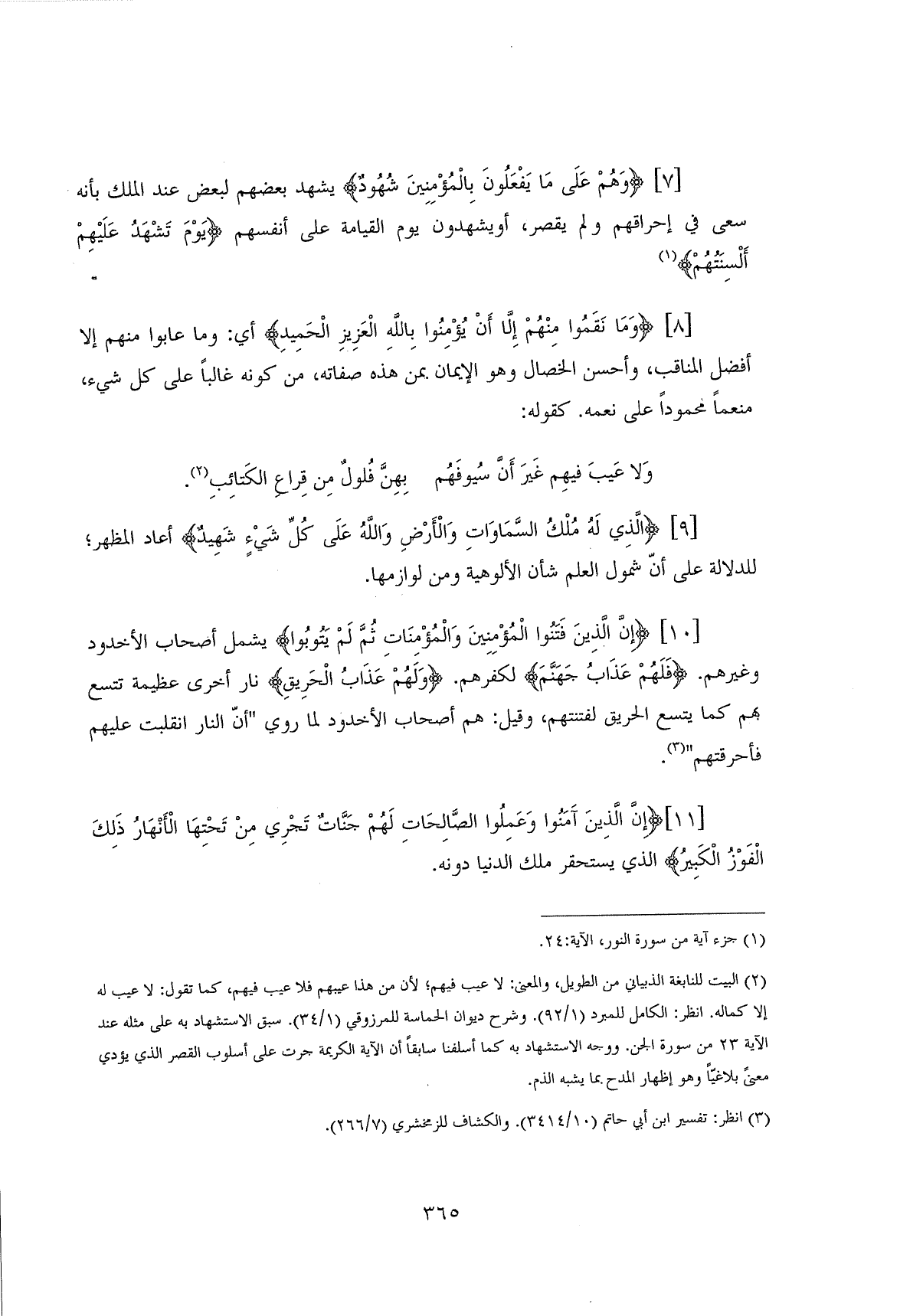 (إِنَّ الَّذِينَ فَتَنُوا الْمُؤْمِنِينَ وَالْمُؤْمِنَاتِ ثُمَّ لَمْ يَتُوبُوا ... (10) يشمل أصحاب الأخدود وغيرهم (فَلَهُمْ عَذَابُ جَهَنَّمَ) لكفرهم. (وَلَهُمْ عَذَابُ الْحَرِيقِ) نار أخرى عظيمة تتسع بهم كما يتسع الحريق لفتنتهم، وقيل: هم أصحاب الأخدود لما روي " أنَّ النار انقلبت عليهم فأحرقتهم ".