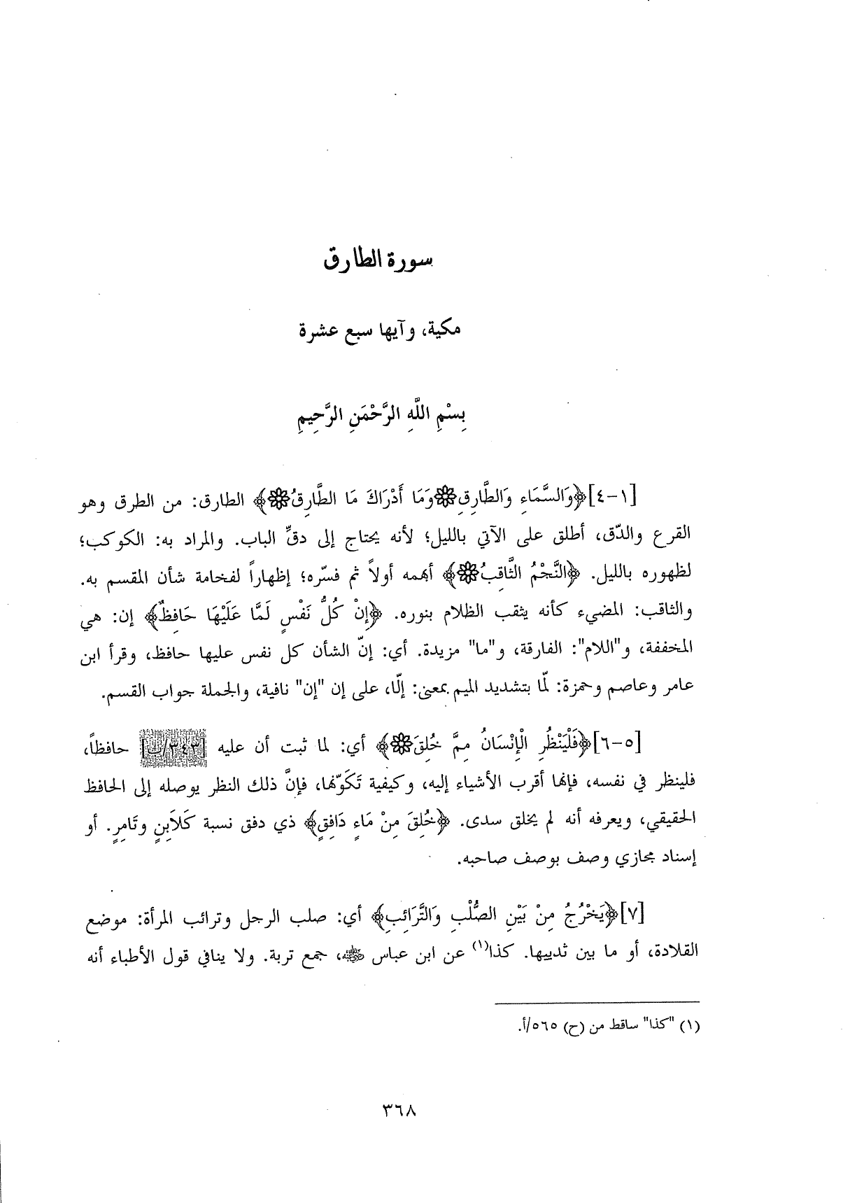 (وَالسَّمَاءِ وَالطَّارِقِ (1) وَمَا أَدْرَاكَ مَا الطَّارِقُ (2) الطارق: من الطرق وهو القرع والدّق، أطلق على الآتي بالليل؛ لأنه يحتاج إلى دق الباب. والمراد به: الكوكب؛ لظهوره بالليل. (النَّجْمُ الثَّاقِبُ (3) أبهمه أولاً ثم فسّره؛ إظهاراً لفخامه شأن المقسم به. والثاقب: المضيء كأنه يثقب الظلام بنوره. (إِنْ كُلُّ نَفْسٍ لَمَّا عَلَيْهَا حَافِظٌ (4) إن: هي المخففة، و " اللام ": الفارقة، و " ما " مزيدة. أي: إنَّ الشأن كل نفس عليها حافظ، وقرأ ابن عامر وعاصم وحمزة: لمّا بتشديد الميم بمعنى: إلَّا، على إن " إن " نافية، والجملة جواب القسم.