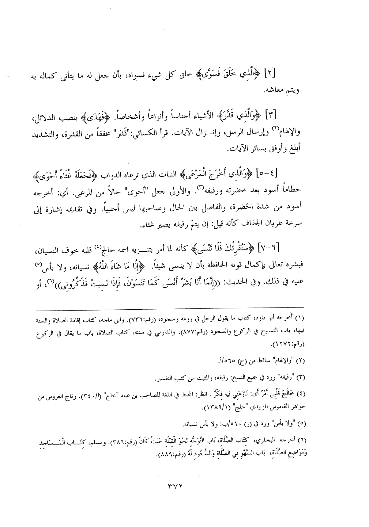 (وَالَّذِي أَخْرَجَ الْمَرْعَى (4) النبات الذي ترعاه الدواب. (فَجَعَلَهُ غُثَاءً أَحْوَى (5) حطاماً أسود بعد خضرته ورفيفه. والأولى جعل " أحوى " حالاً من المرعى. أي: أخرجه أسود من شدة الخضرة، والفاصل بين الحال وصاحبها ليس أجنبياً. وفي تقديمه إشاره إلى سرعة طريان الجفاف كأنه قيل: إن يتمّ رفيفه يصير غثاء.