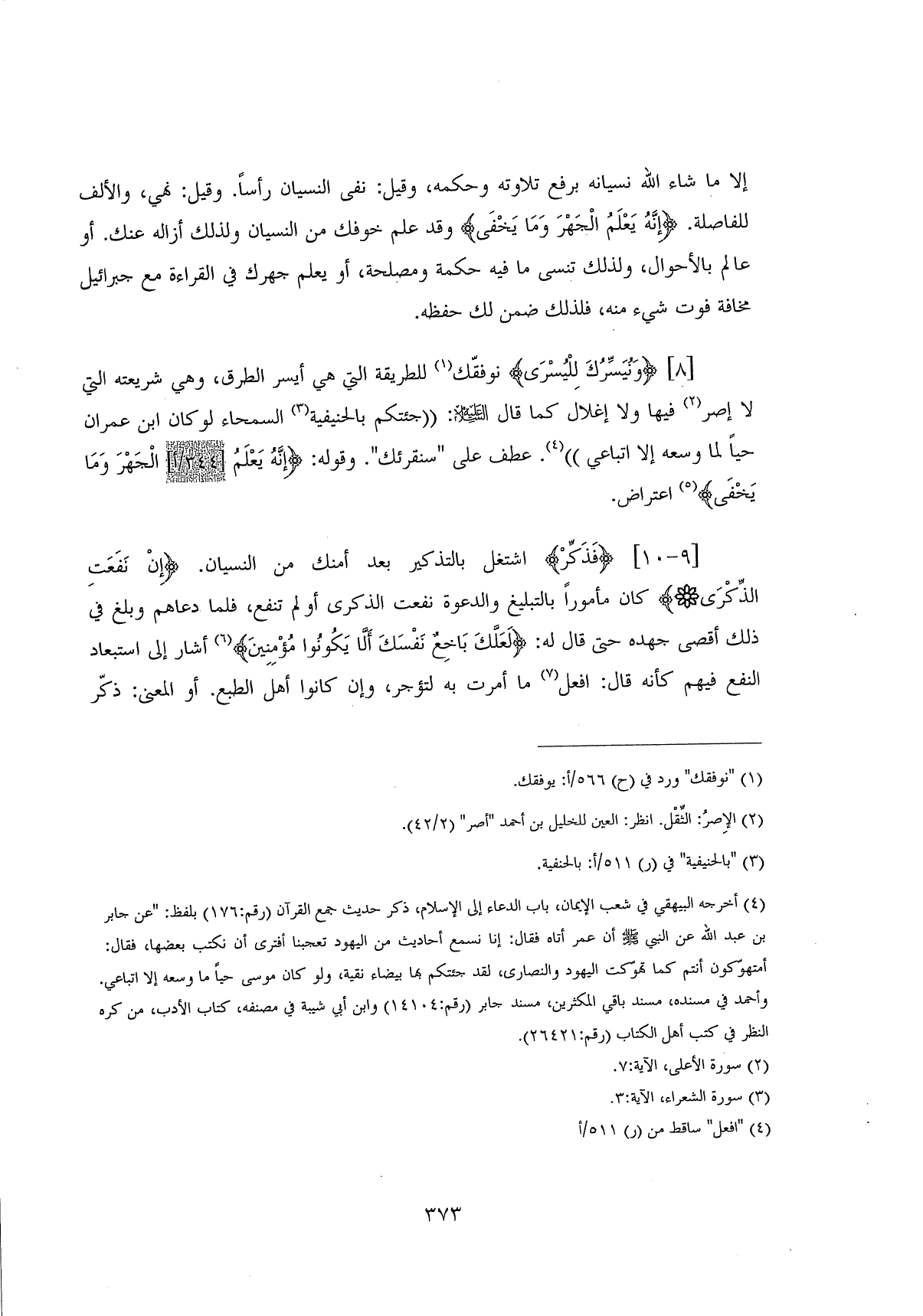 إلا ما شاء اللَّه نسيانه برفع تلاوته وحكمه، وقيل: نفى النسيان رأساً. وقيل: نهي، والألف للفاصلة. (إِنَّهُ يَعْلَمُ الْجَهْرَ وَمَا يَخْفَى) وقد علم خوفك من النسيان ولذلك أزاله عنك. أو عالم بالأحوال، ولذلك تنسى ما فيه حكمة ومصلحة، أو يعلم جهرك في القراءة مع جبرائيل مخافة فوت شيء منه، فلذلك ضمن لك حفظه.