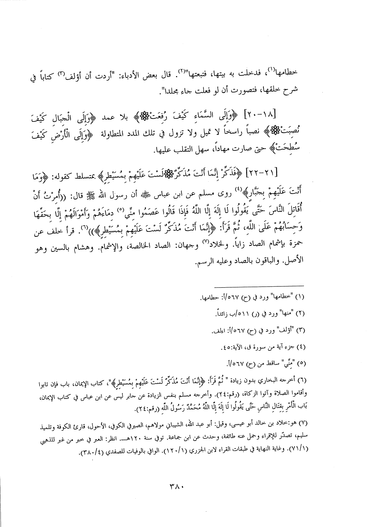 فَذَكِّرْ إِنَّمَا أَنْتَ مُذَكِّرٌ (21) لَسْتَ عَلَيْهِمْ بِمُصَيْطِرٍ (22) بمتسلط كقوله: (وَمَا أَنتَ عَلَيْهِمْ بِجَبَّارٍ) روى مسلم عن ابن عباس - رضي الله عنهما - أن رسول اللَّه - صلى الله عليه وسلم - قال: " أُمِرتُ أَنْ أُقَاتِلَ النِّاسَ حَتَّى يَقُولوا لَا إِلَهَ إِلَّا اللَّه فَإِذا قَالُوا عَصموا مِنِّي دِمَاءَهمْ وَأَموَالَهُم إِلا بِحَقِّهَا وَحسابُهُمْ عَلَى اللَّهِ، ثُمَّ قرَأَ: (إِنَّمَا أَنْتَ مُذَكِّرٌ * لَسْتَ عَلَيْهِمْ بِمُصَيْطِرٍ) ". قرأ خلف عن حمزة بإشمام الصاد زاياً. ولخلاد وجهان: الصاد الخالصة، والإشمام. وهشام بالسين وهو الأصل. والباقون بالصاد وعليه الرسم.